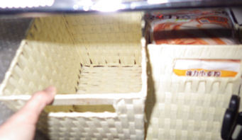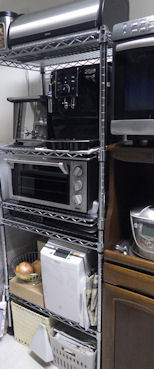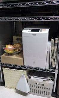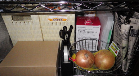 食材の予備やマイバックを置いてる棚に置く事に。。