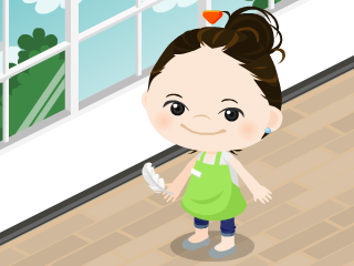 黄緑のエプロン。手には鳥の羽