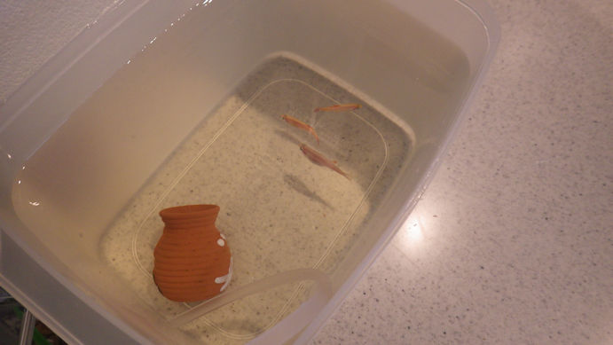 マメ(魚)とエビさんをうつして。(エビさんはツボの中に隠れてます)