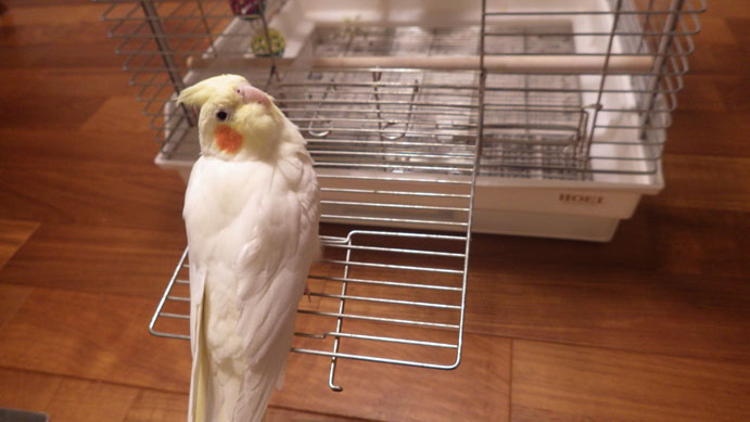 今、放鳥しても ゲージかまめ嫁の頭や肩に乗って