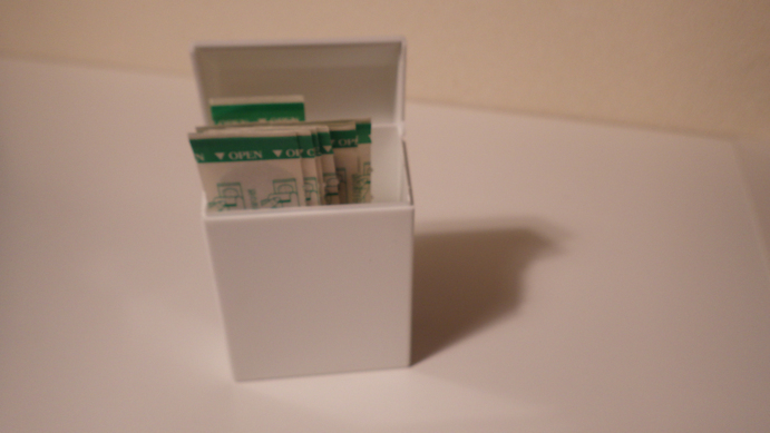 絆創膏なんて引き出しには紙箱の上部を切って入れて…箱の柄はそのまま。