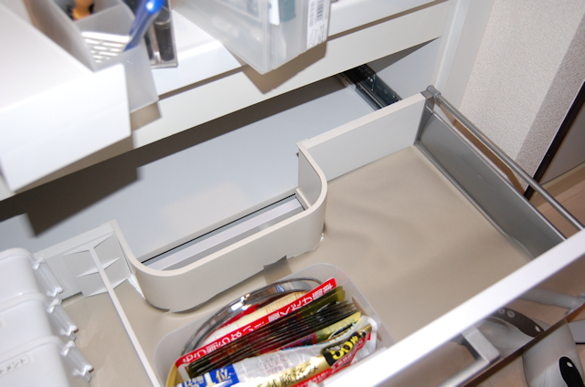 左側がまめ嫁用。1dpダストボックスは引き出し手前に2つ並べて納めました。