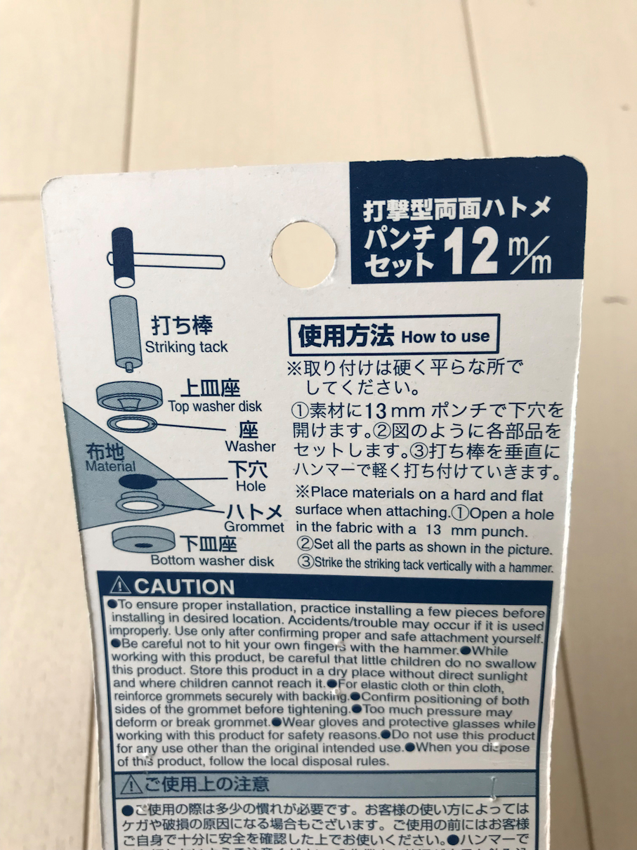 袋に入っている2個入りのオーニングフック・ハトメとハトメの工具セットはダイソーで購入