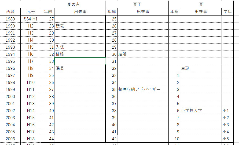 この「家族年表」、家計簿を見直す時にも良く作るものですが、