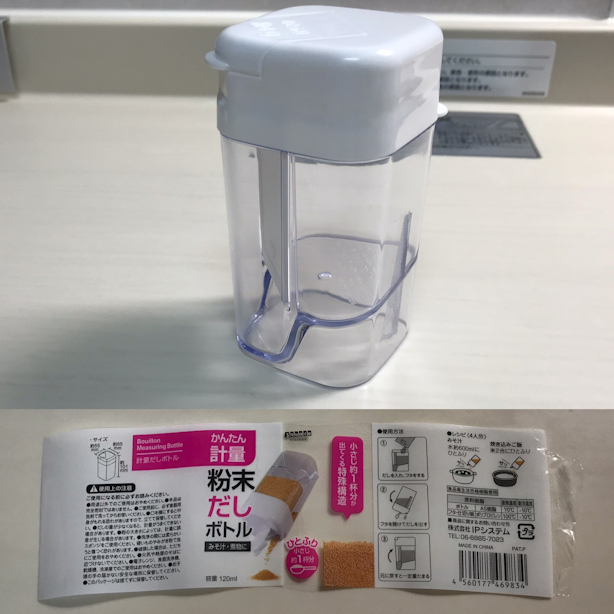 めちゃめちゃおススメです。100均の「粉末だしボトル」コレ↓