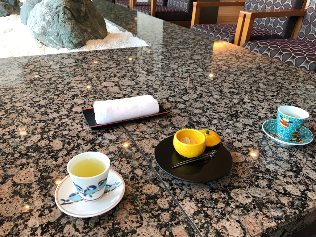 桃の香りのお茶とミカンのお菓子でお出迎え。