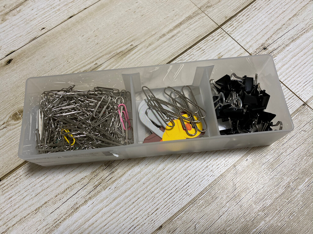 クリップの種類ごとに分けられる仕切り付きの容器を探していたら、ダイソーで良いモノ発見!!