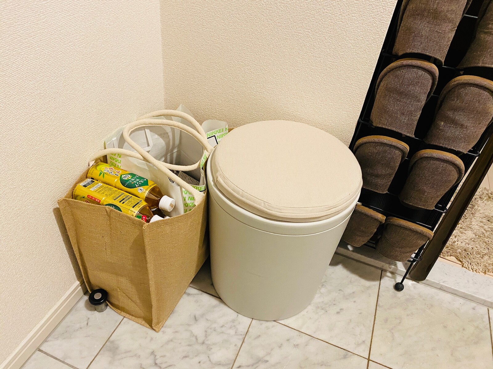古新聞を入れる袋と主人に毎日1本持参して貰っているヘルシア。