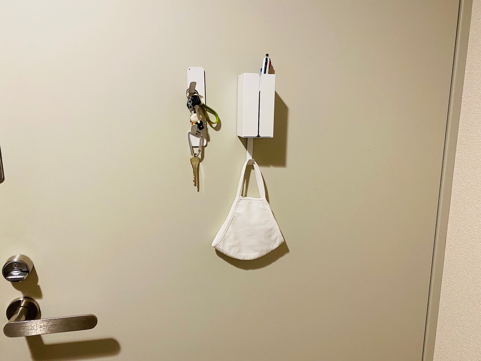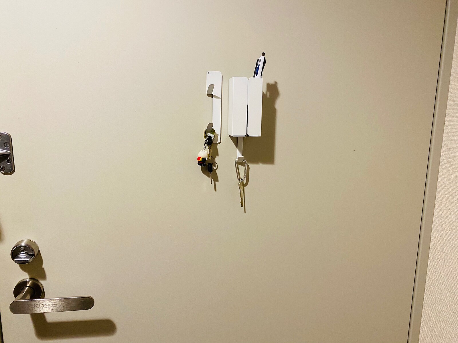 のぞき穴隠しを兼ねて ダイソーのマグネットポケットとマグネットフックを設置。