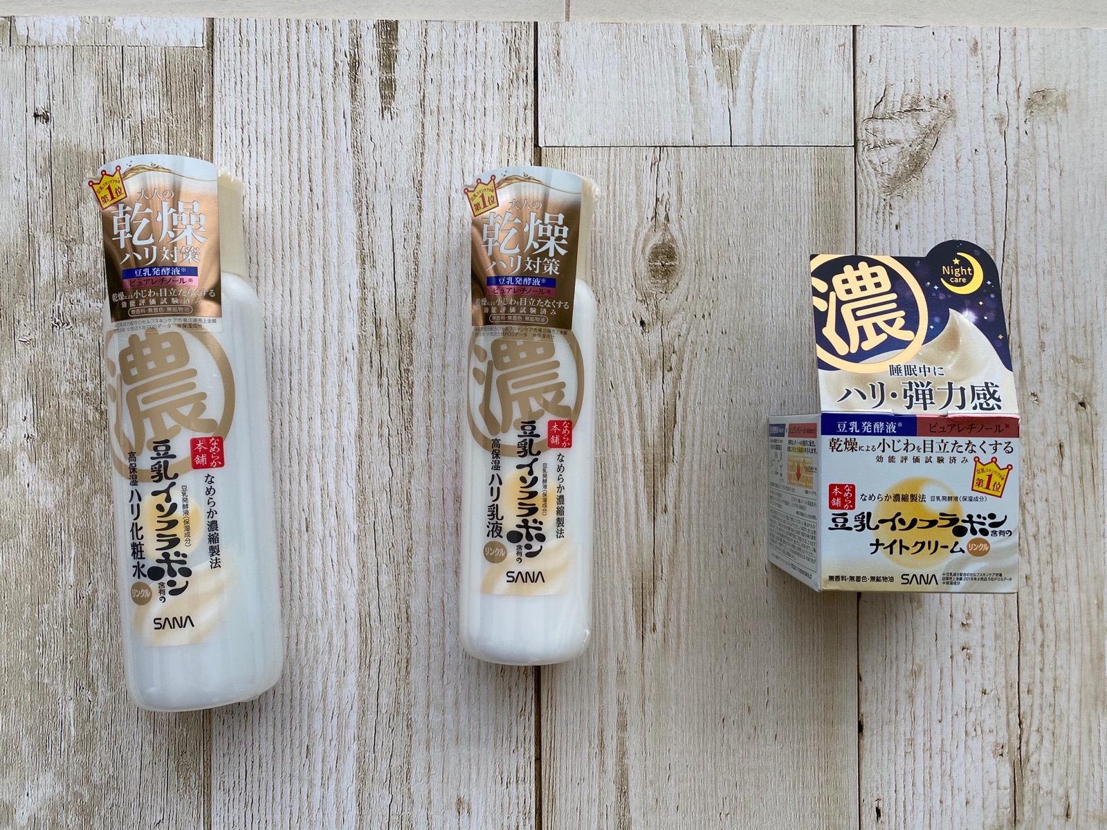 豆乳イソフラボンの化粧水・乳液のセット+ナイトクリーム。