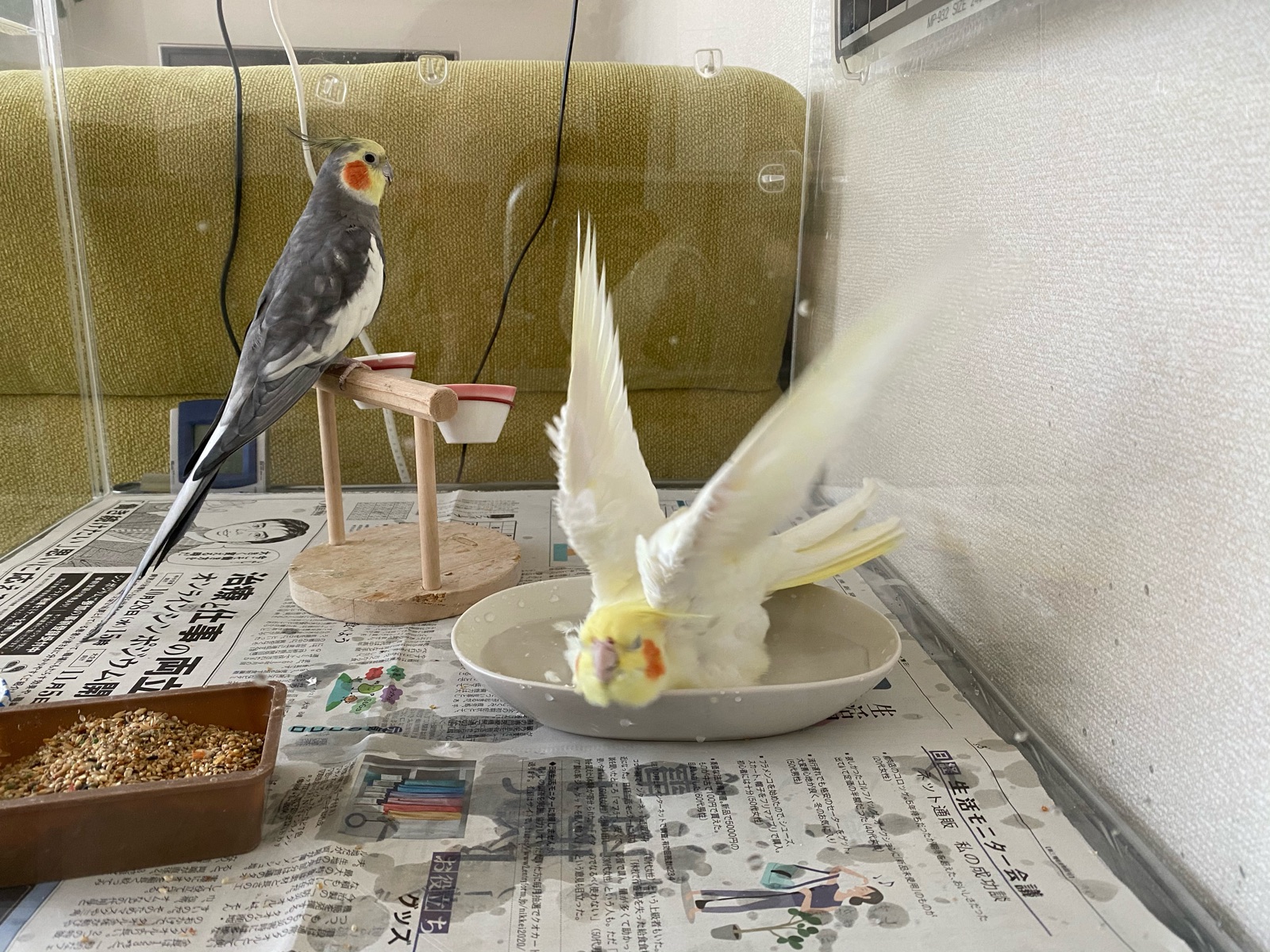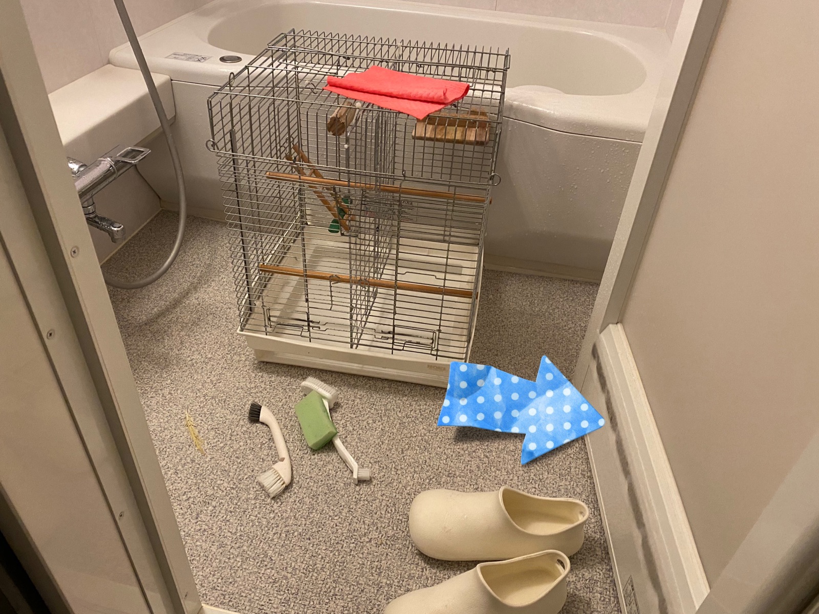 オカメ’sのケージを浴室で丸洗いする間に