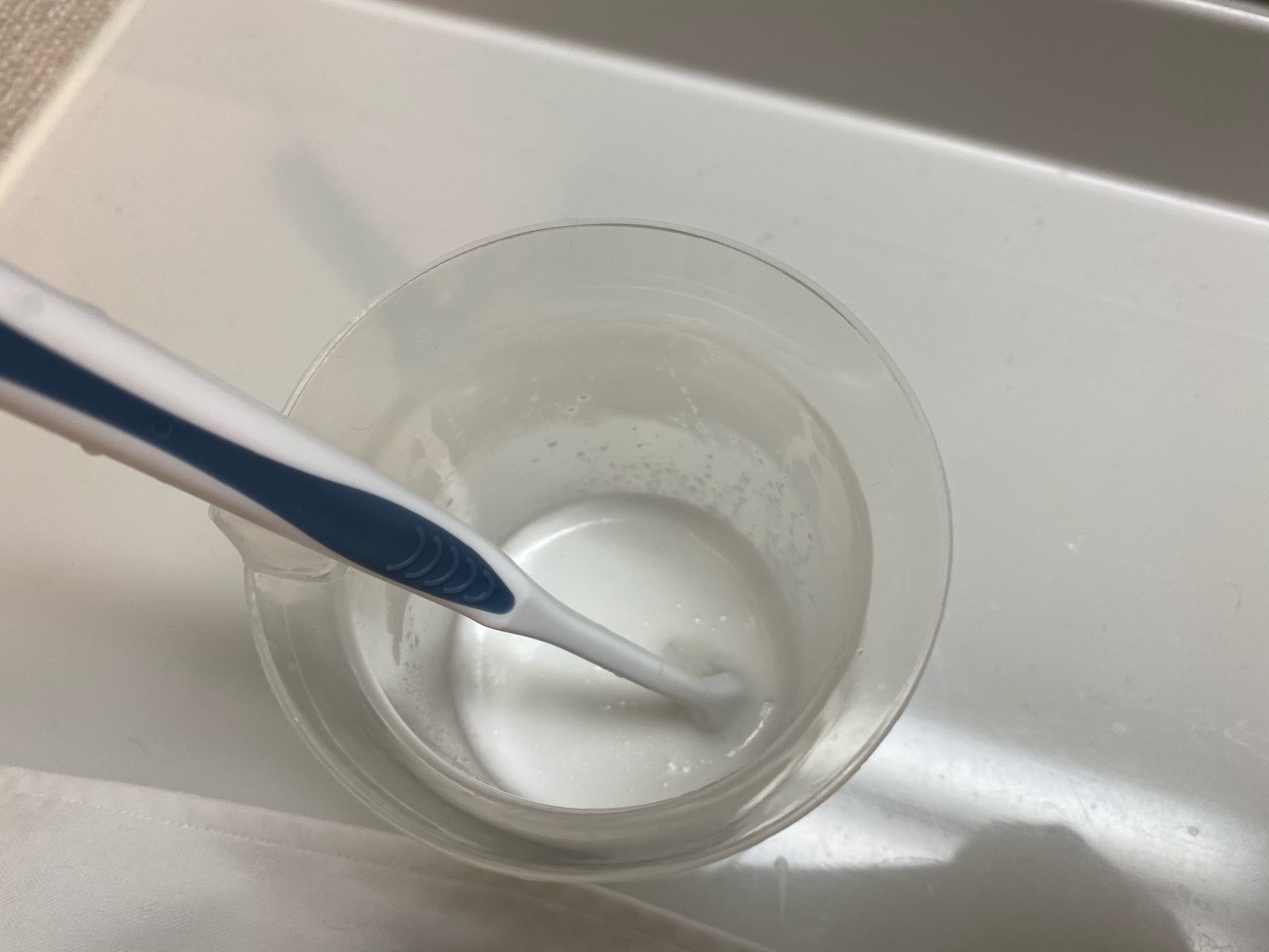 魔法水に浸した歯ブラシで、黄ばみ部分を軽くこすり洗い。