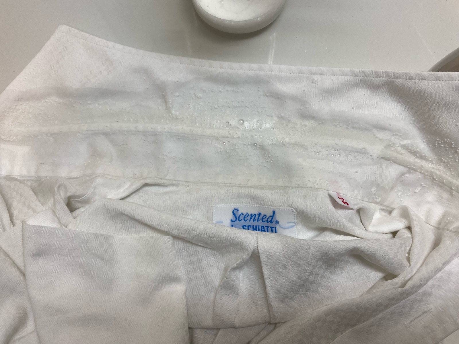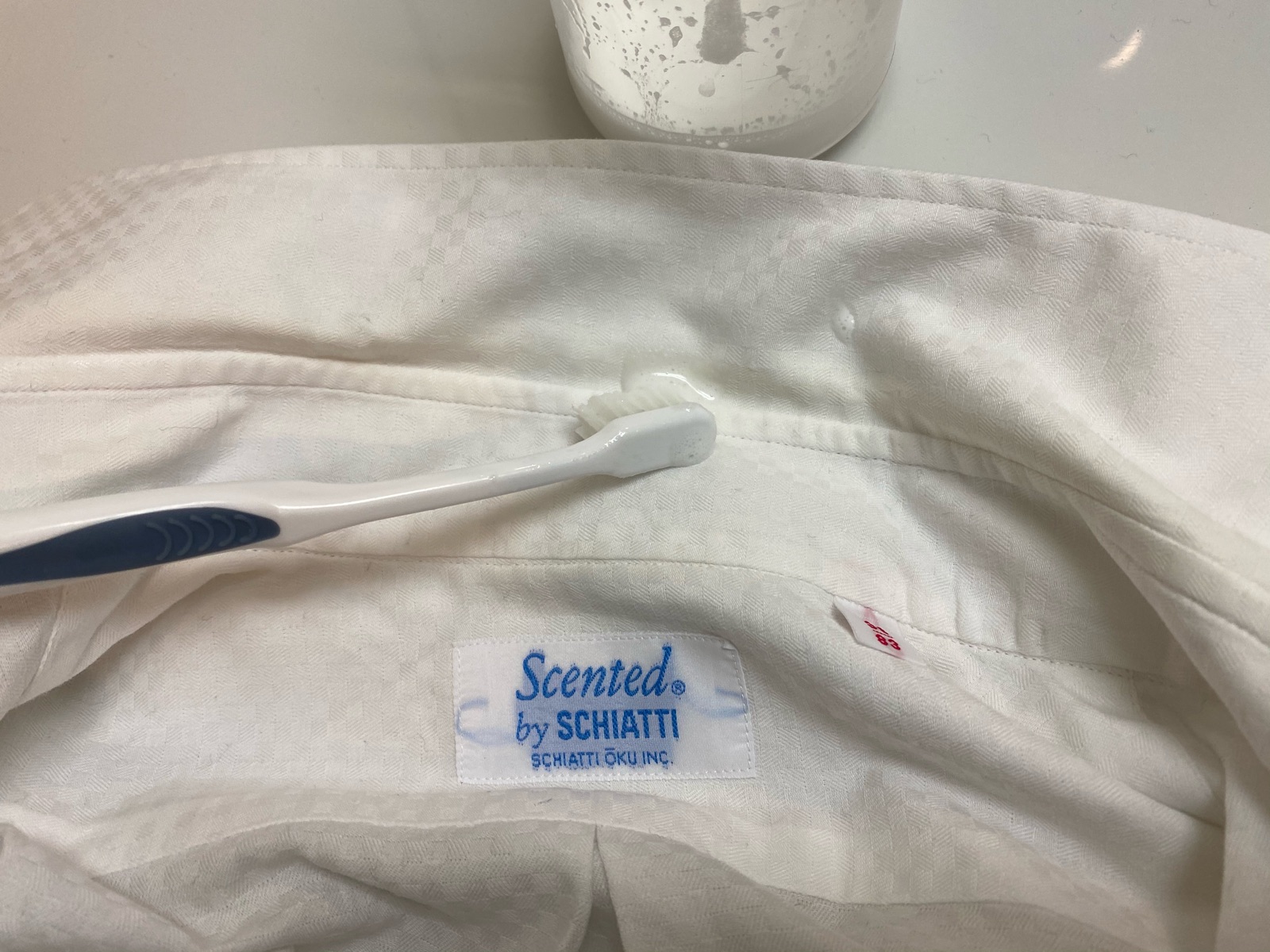 襟元、袖の黄ばみ部分に魔法水を塗り、暫く放置。