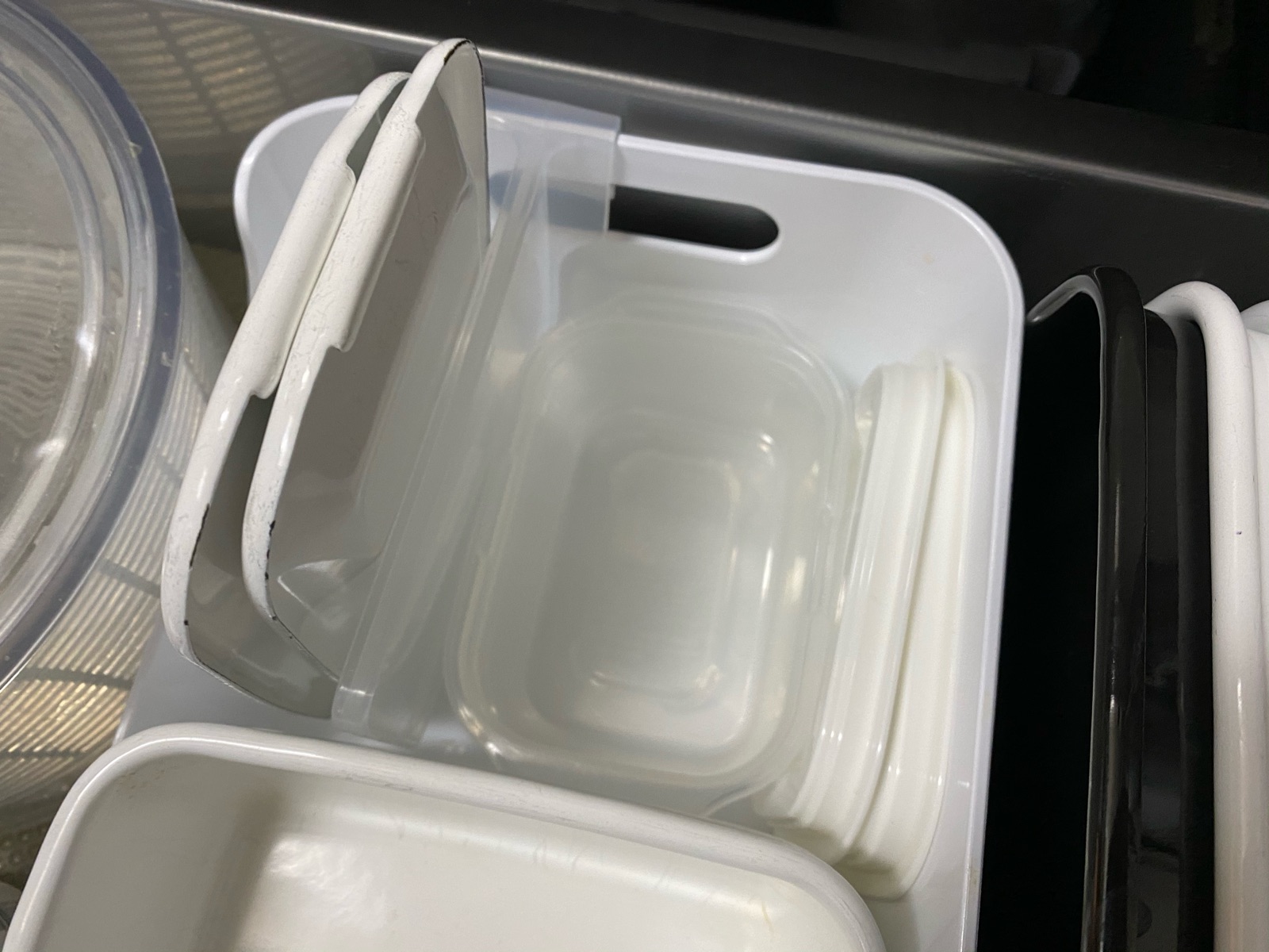 キッチンシンク下引き出しに、IKEAのバリエラボックスの中を保存容器入れとして利用。