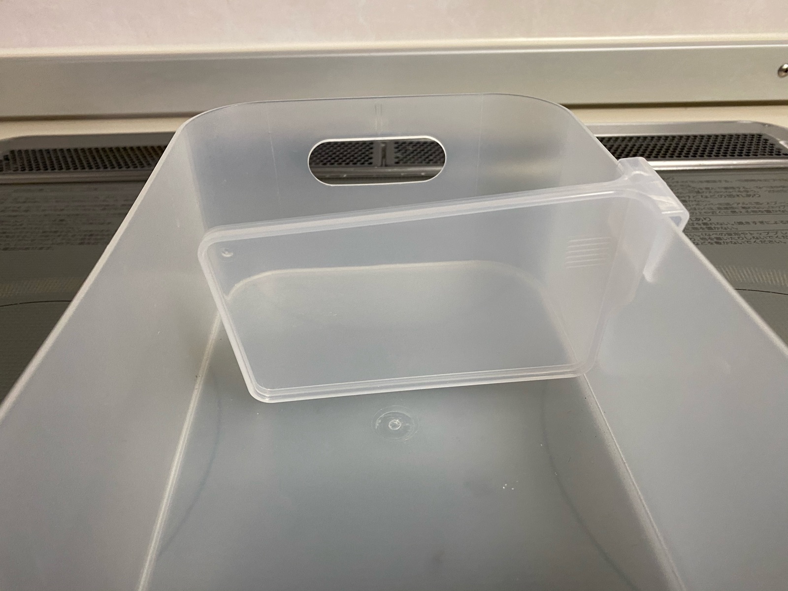 これで蓋が倒れる事も無く、またプラの容器も取り出しやすくなりました。