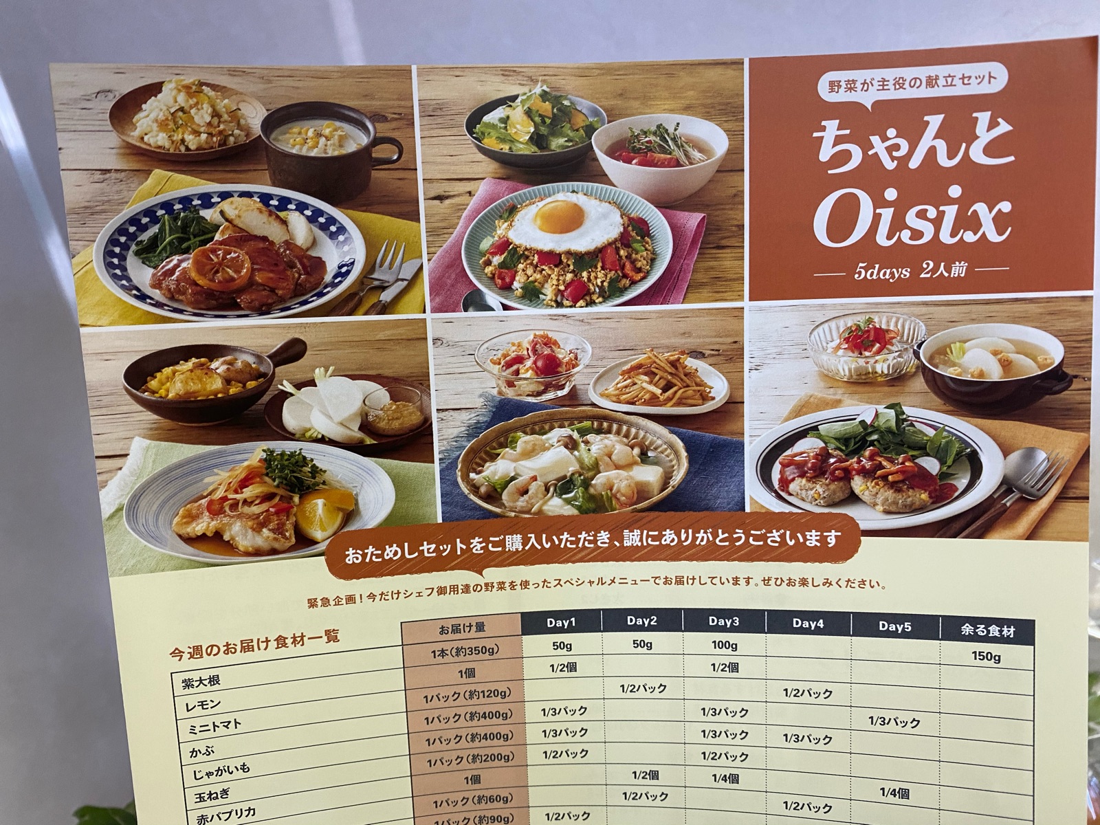 Oisix(オイシックス)の緊急企画で5Daysの野菜が主役の献立セットが半額!!