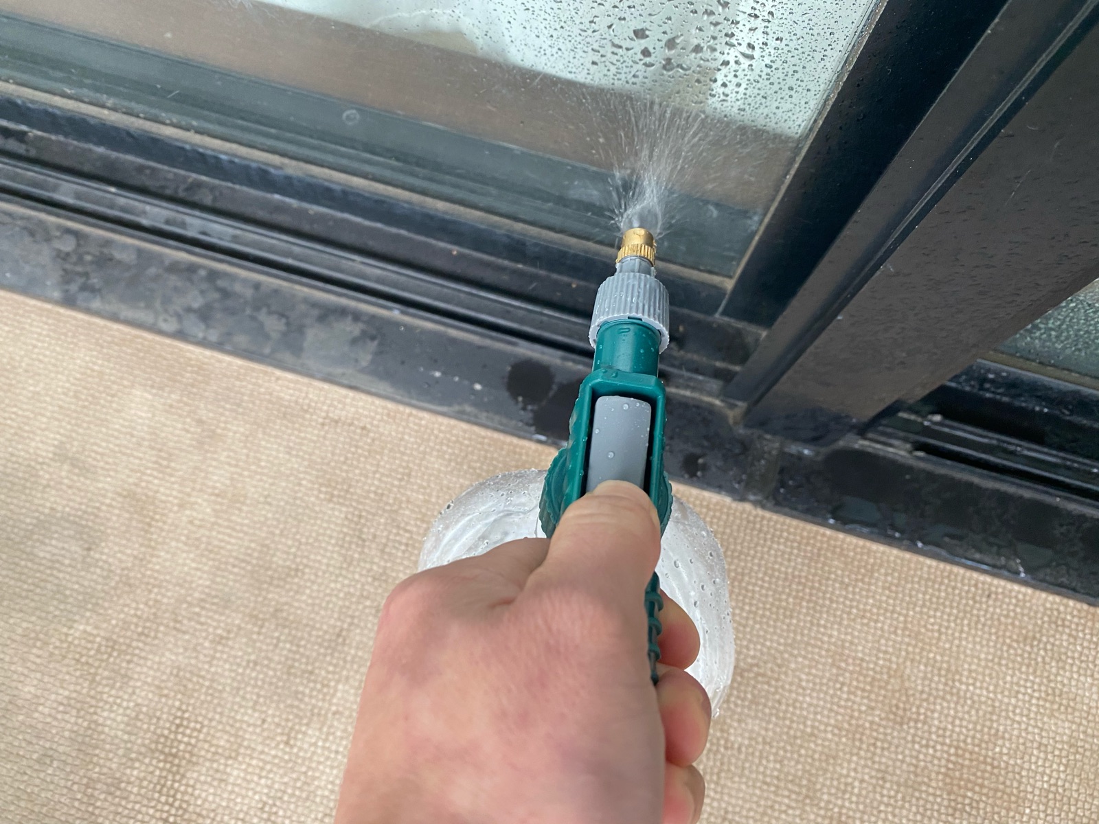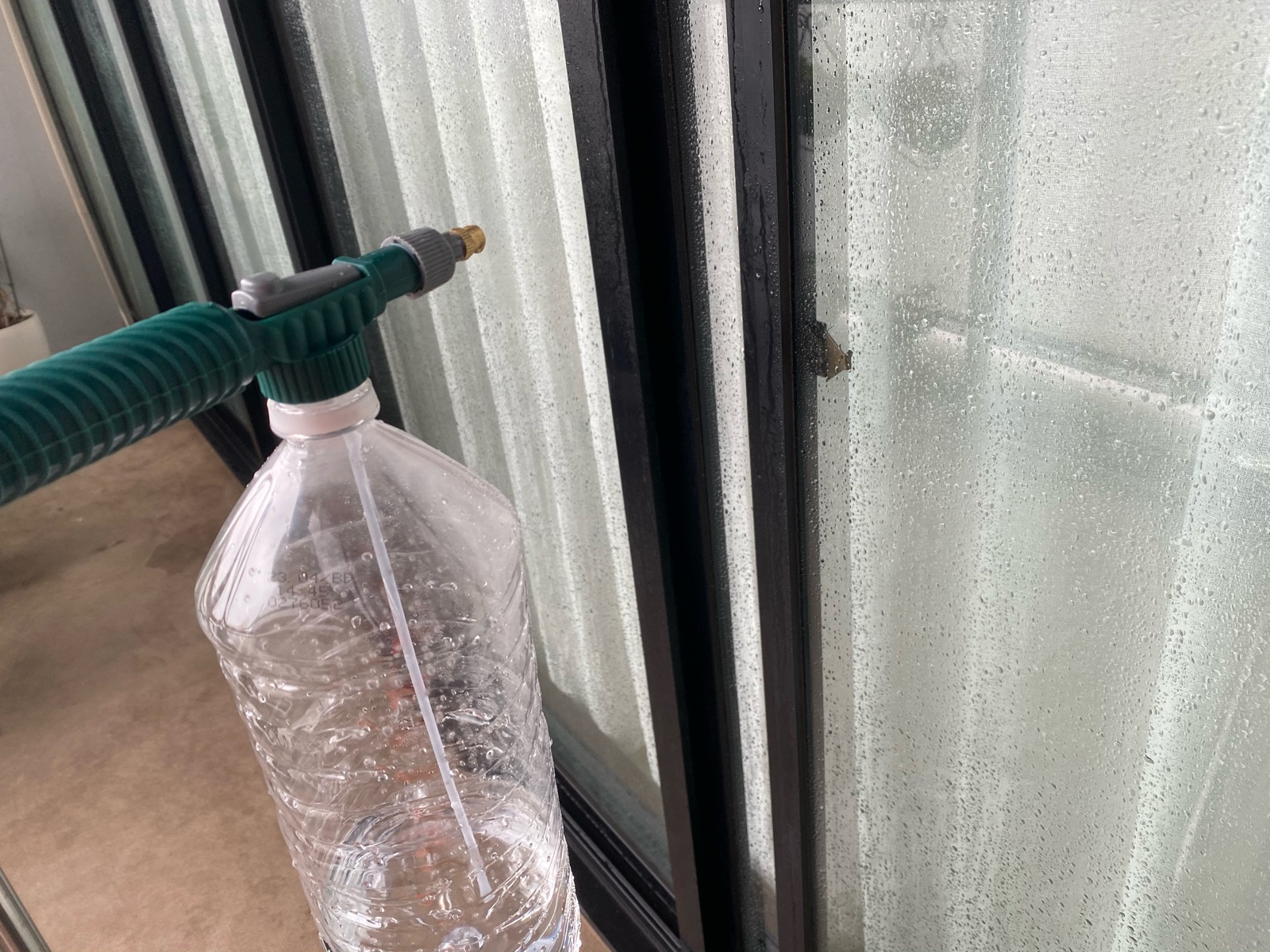 2Lのペットボトルに水を入れて、6枚の大きな窓ガラス全体にしっかりとスプレーしても