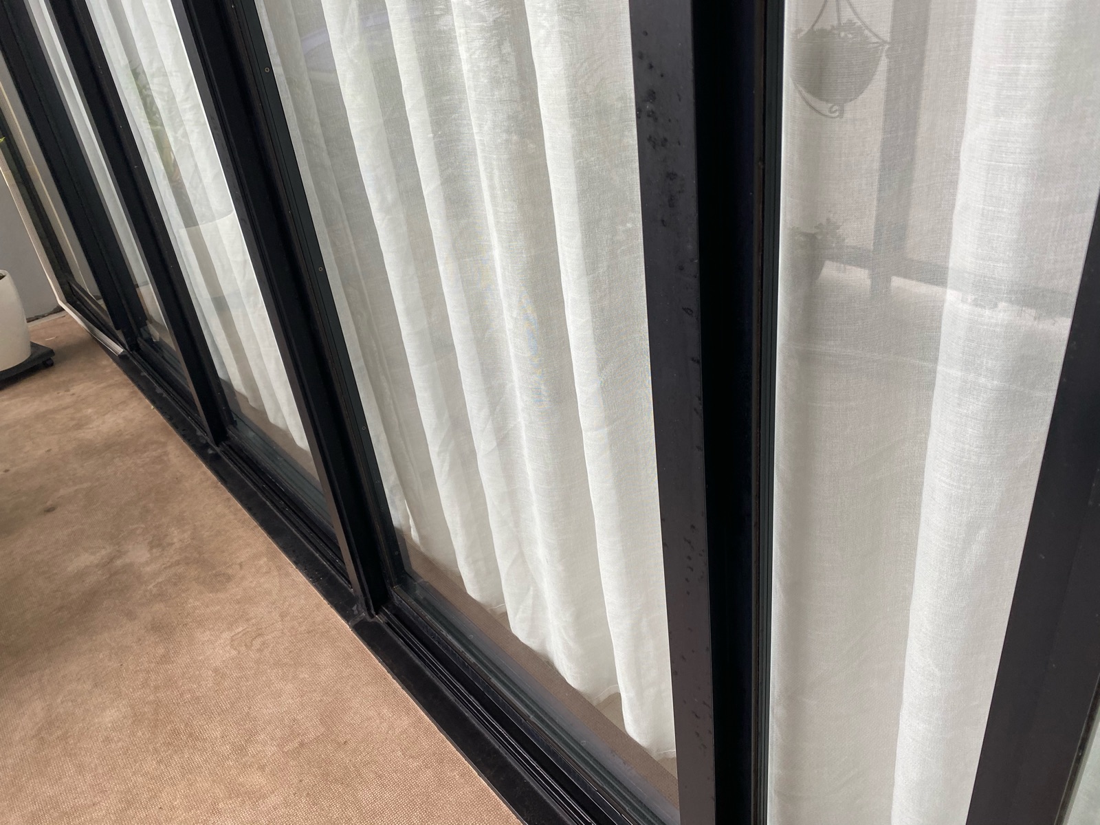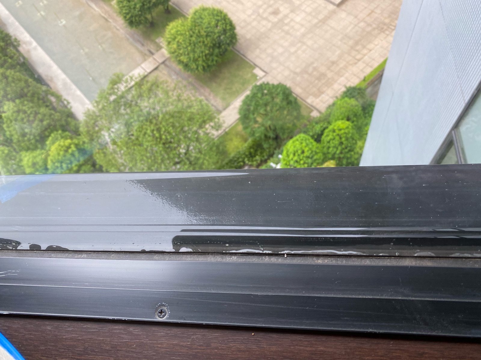 サッシの黒い部分が黄砂や土埃で茶色くなっており、