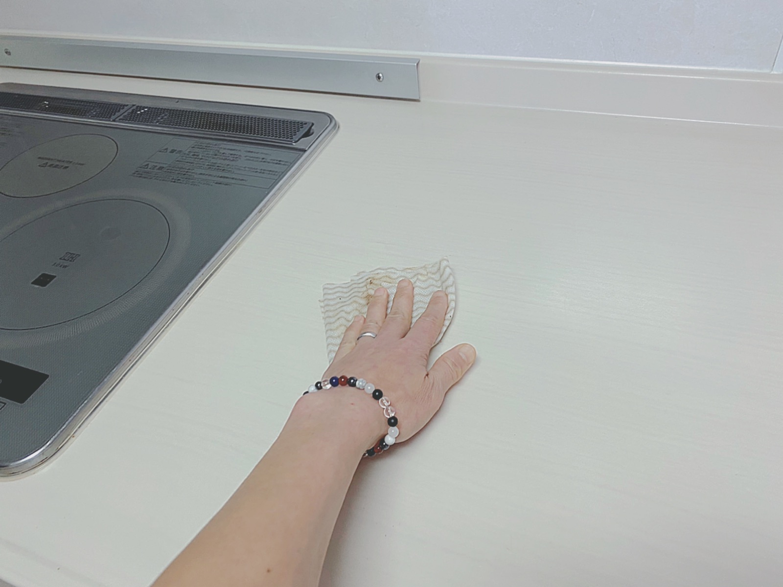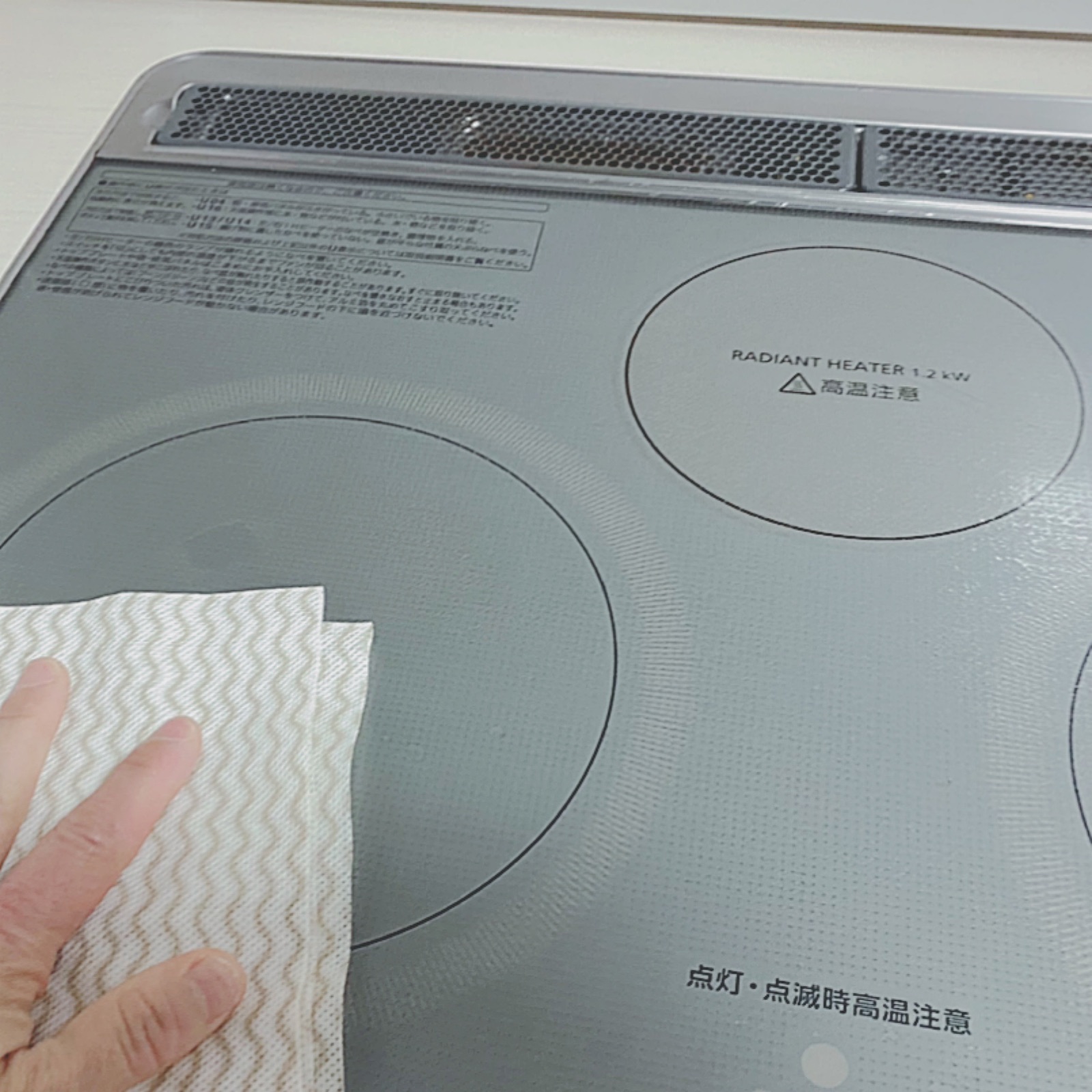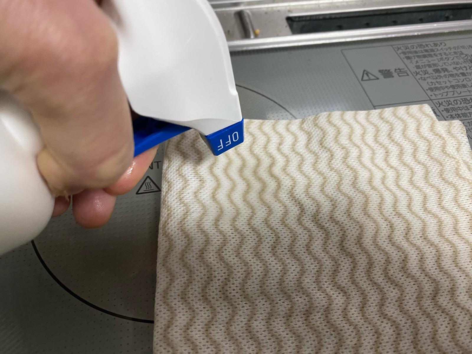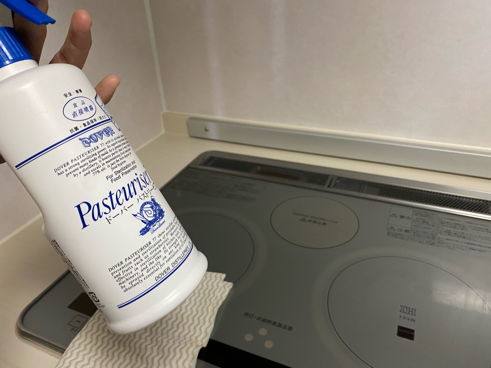 食器を拭く前にIHコンロを消毒。(IHの上に拭いた食器を並べる為)