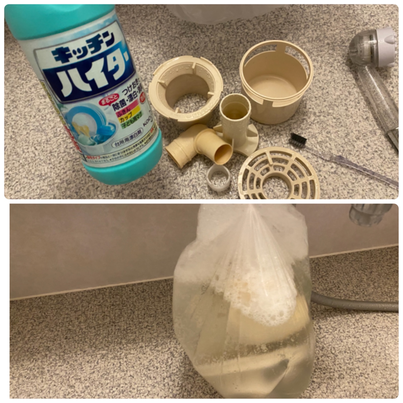 レジ袋に部品を入れてキッチンハイターでつけ置き漂白・除菌。