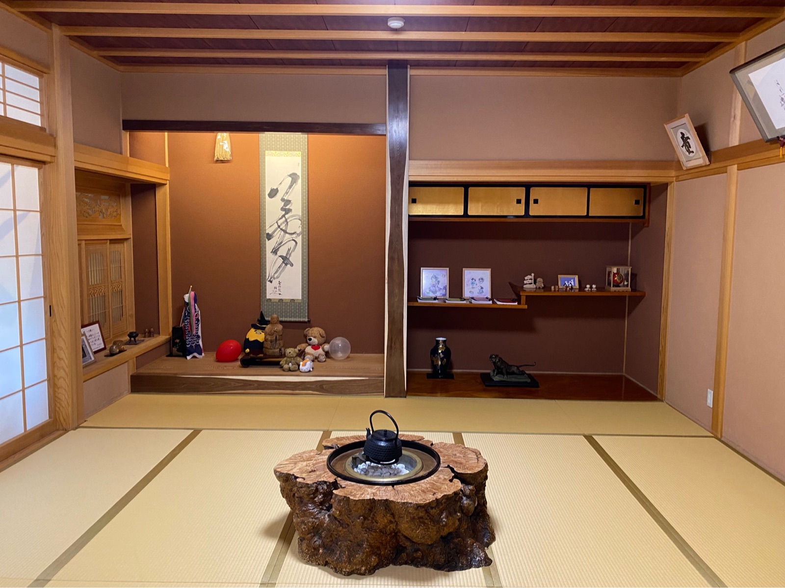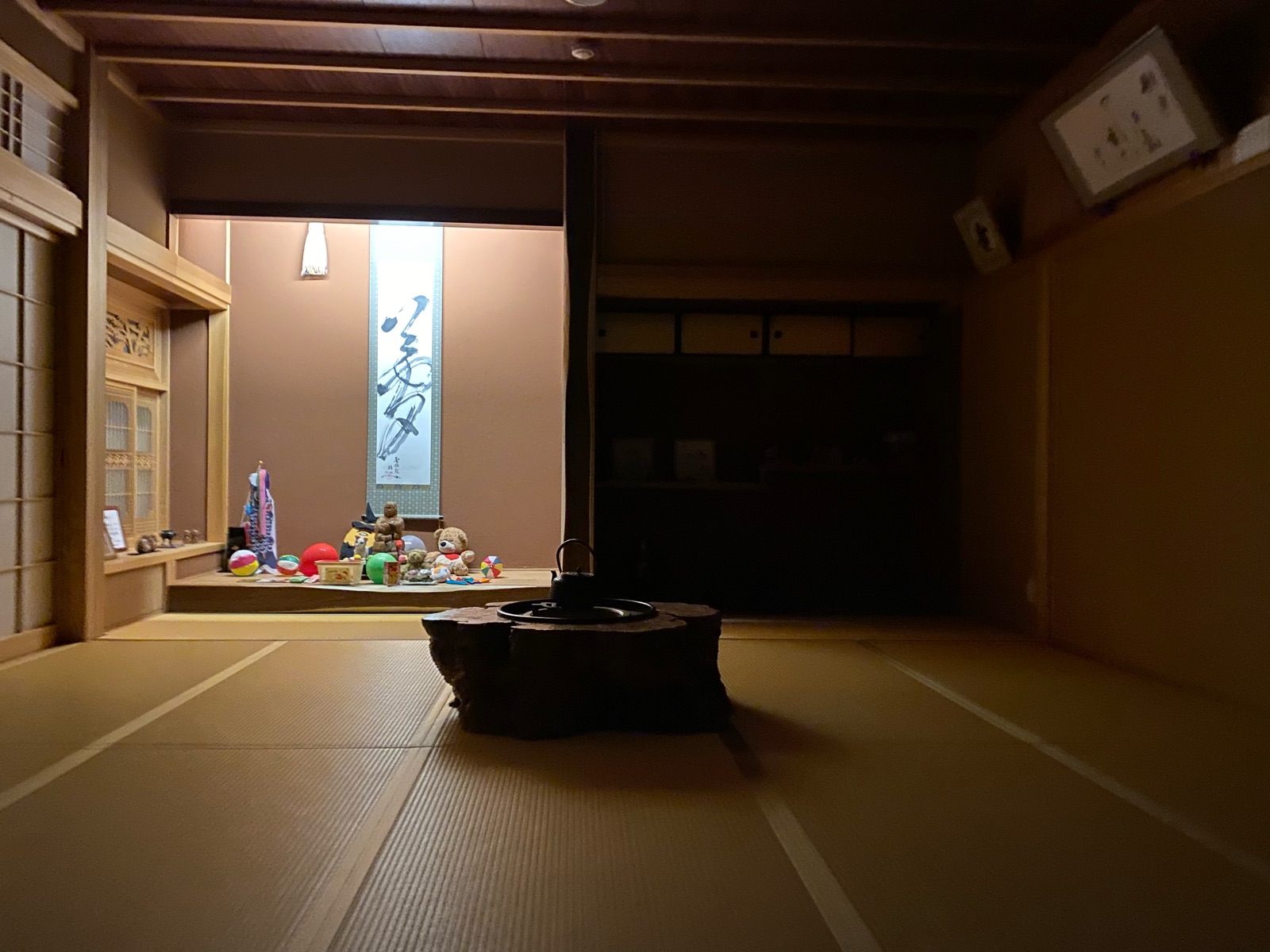 夜はこんな感じで床の間以外の照明は消えているのですが、人が入れ替わり立ち代わりやって来て