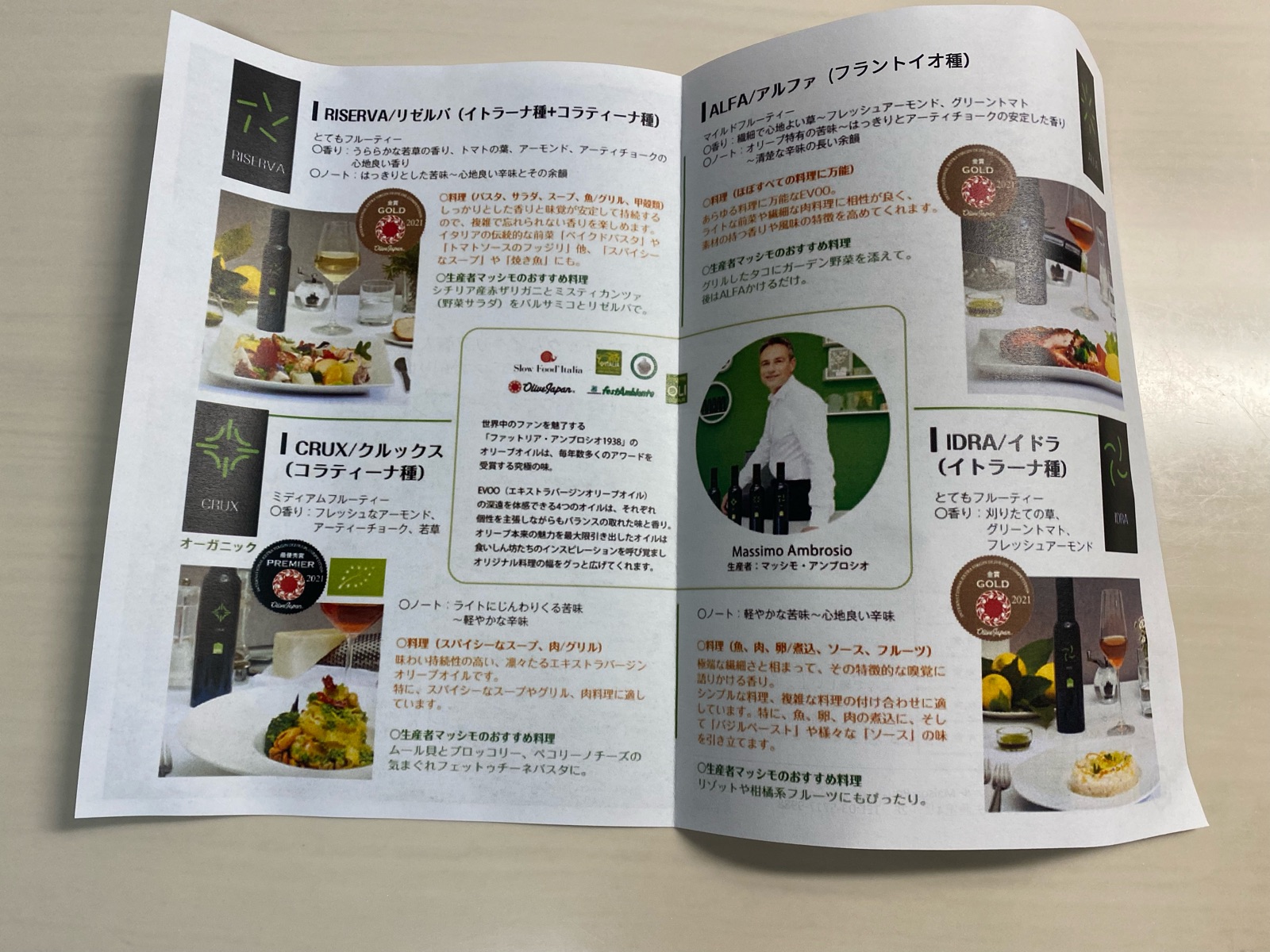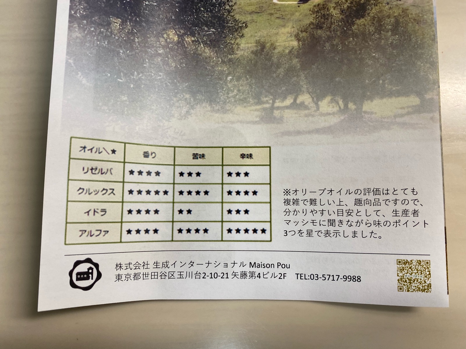 強い辛味と余韻が長く続く香り、オリーブオイル好きにはたまらない芳香と苦味と辛味が力強いバランスで本当に素晴らしい味わいです。(商品紹介のHPより引用)