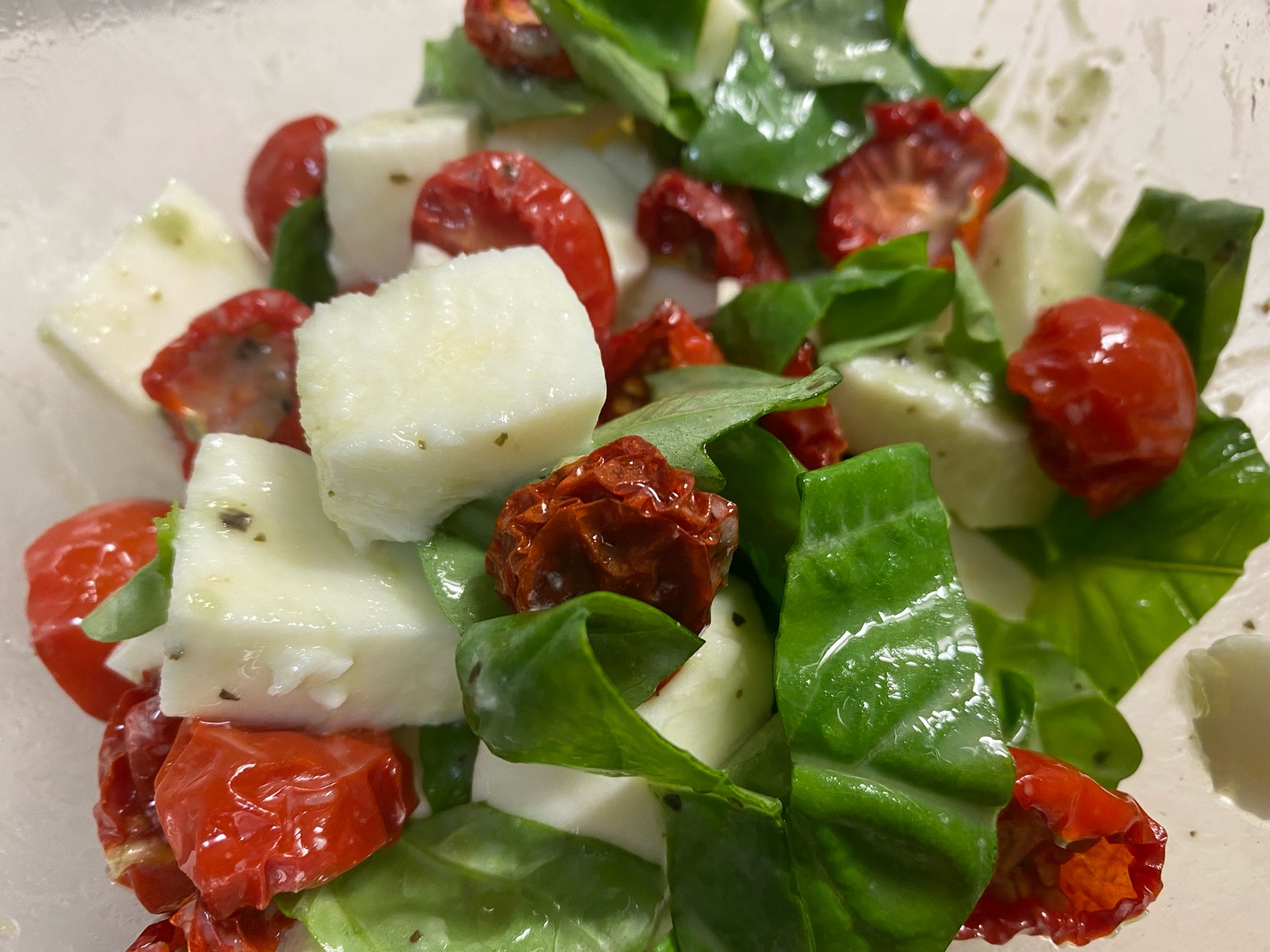良くあるスライスにしてカプレーゼも良いのですが、我が家はモッツァレラチーズを一口大にカットして、セミドライトマトとフレッシュバジルに