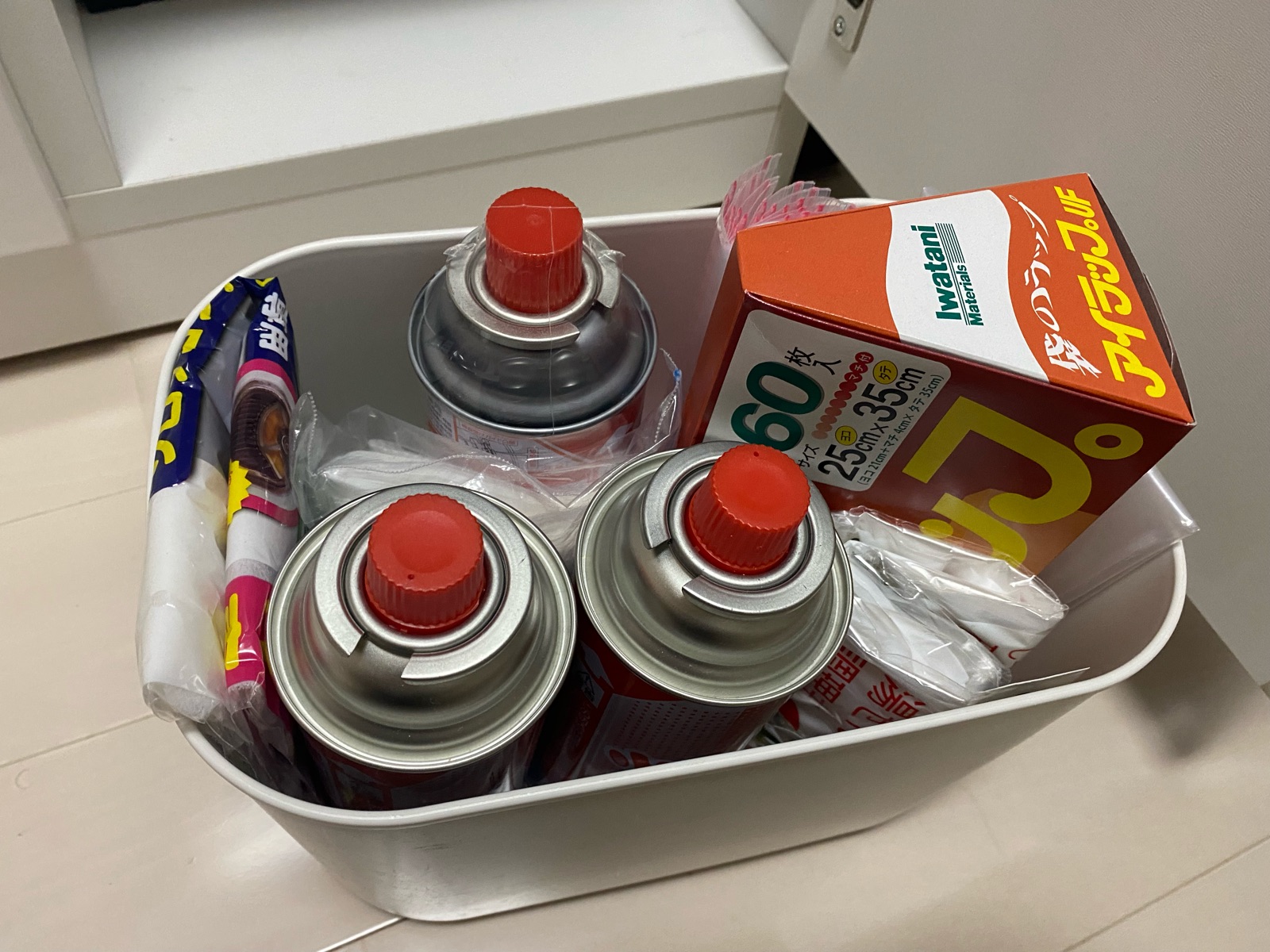 元々収納していたカセットコンロ・セリアのハンドル付きソフトライナケース・ニトリのファイルケースの3つを並べて収納出来たので