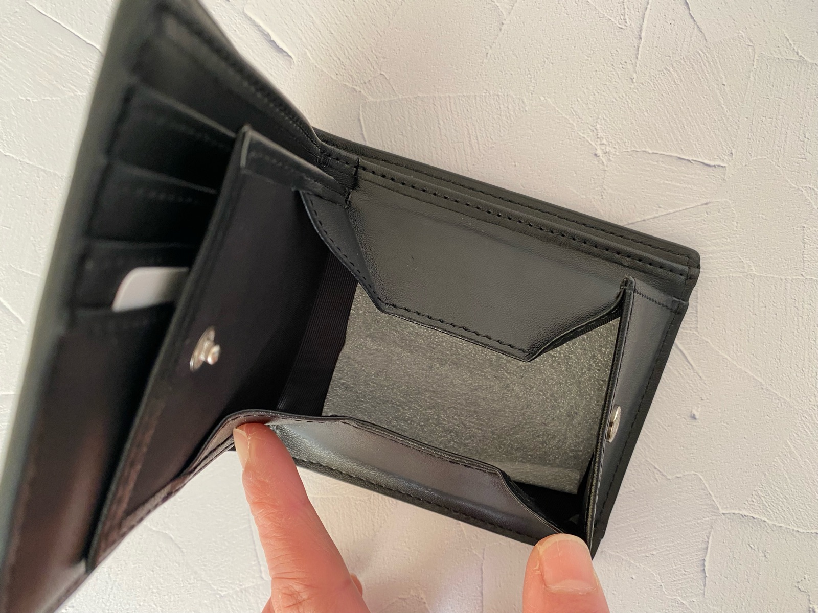 コインポケットは大きく開き、男の人の指でも硬貨が取り出しやすい!