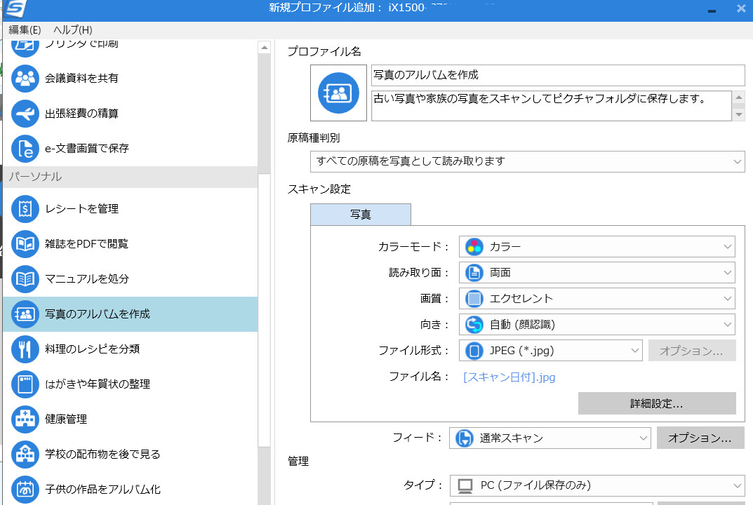 専用アプリから、スキャンするものに適したファイルを選び(設定を自分好みに変更もok)登録。