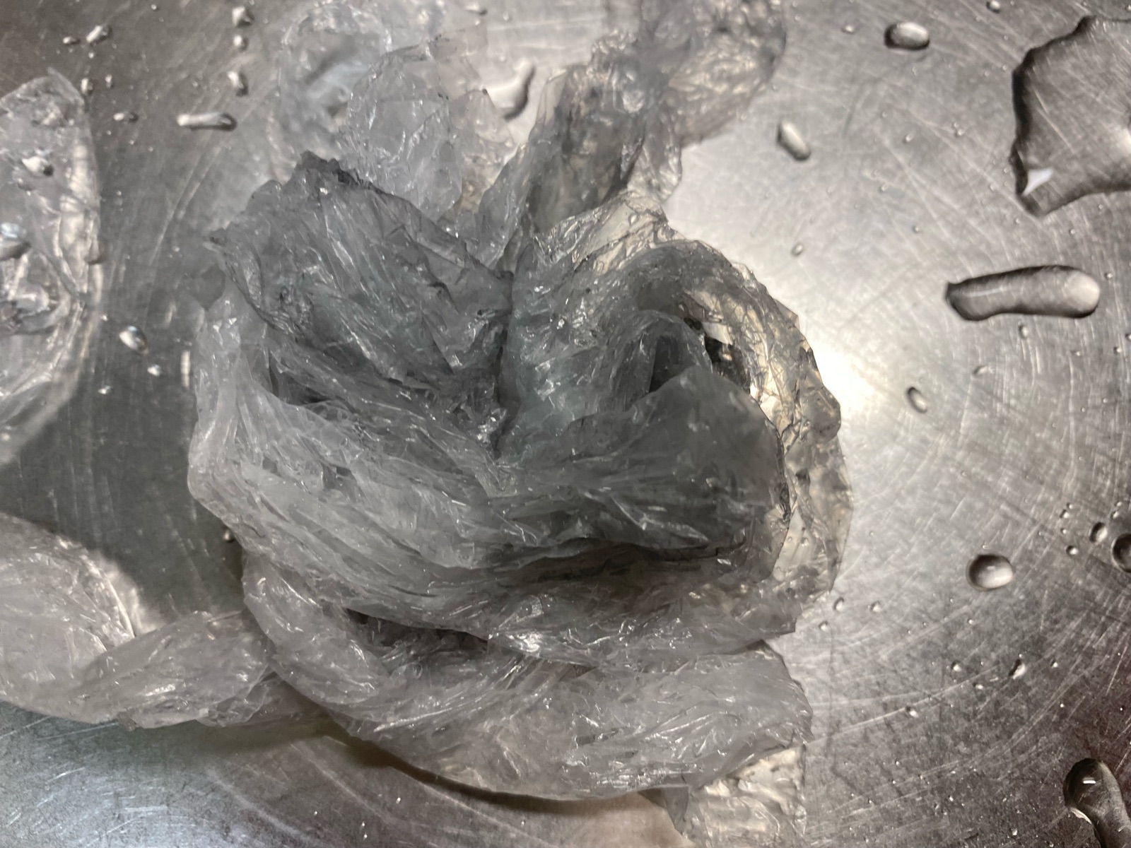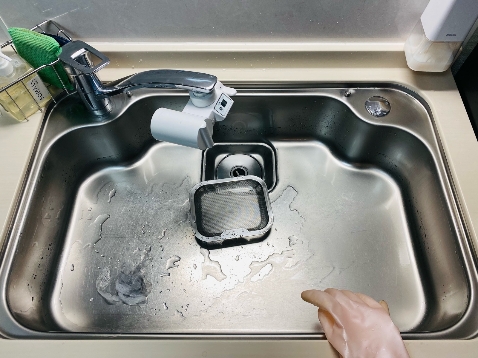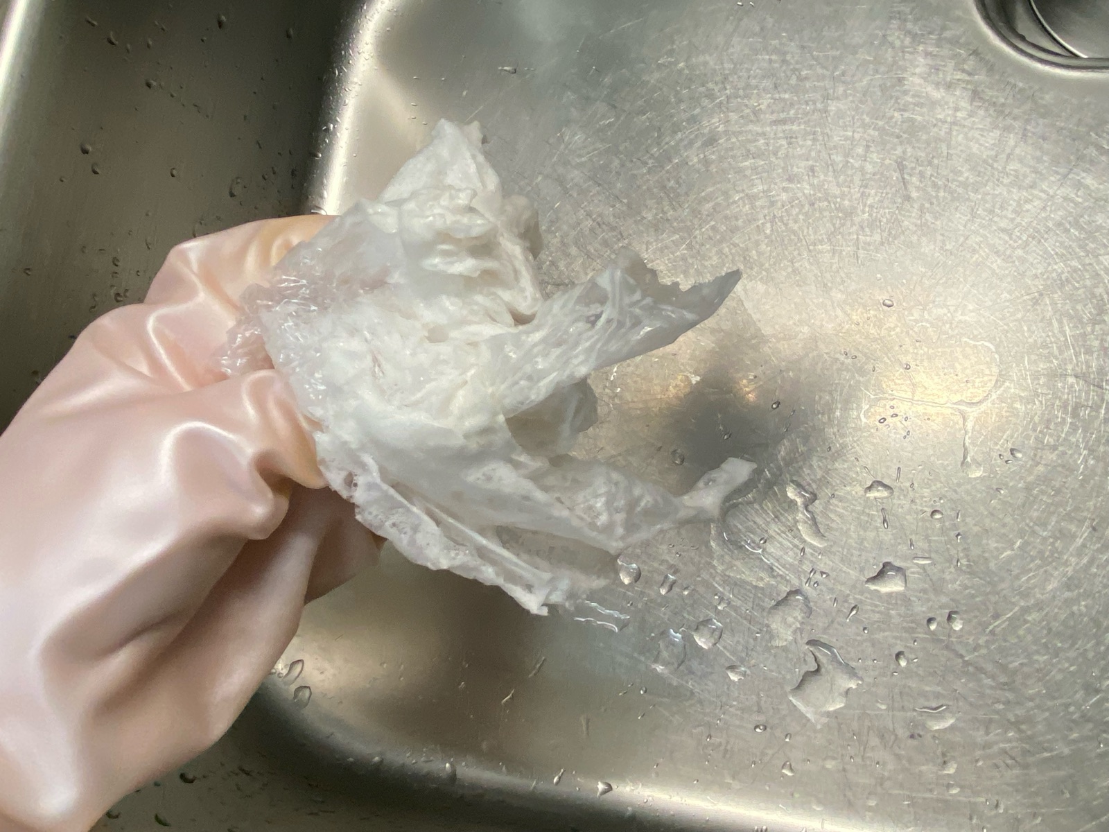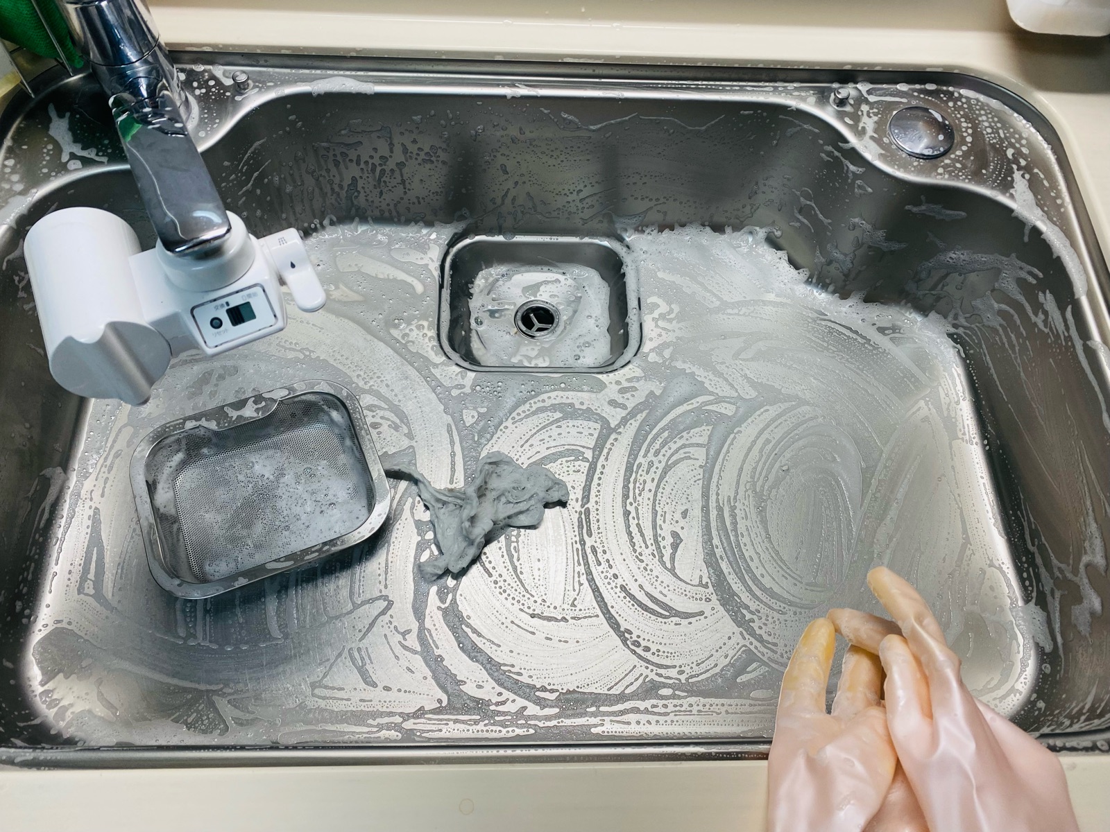 ゴム手袋にも黒いシンクの膜汚れが付着。