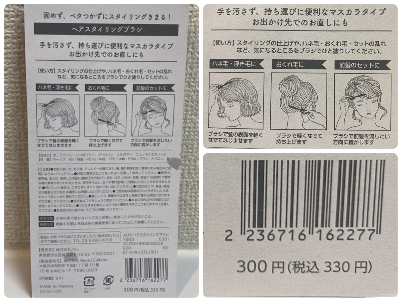 3coinsのヘアスタイリングブラシはマスカラと同じ様な細長さなので