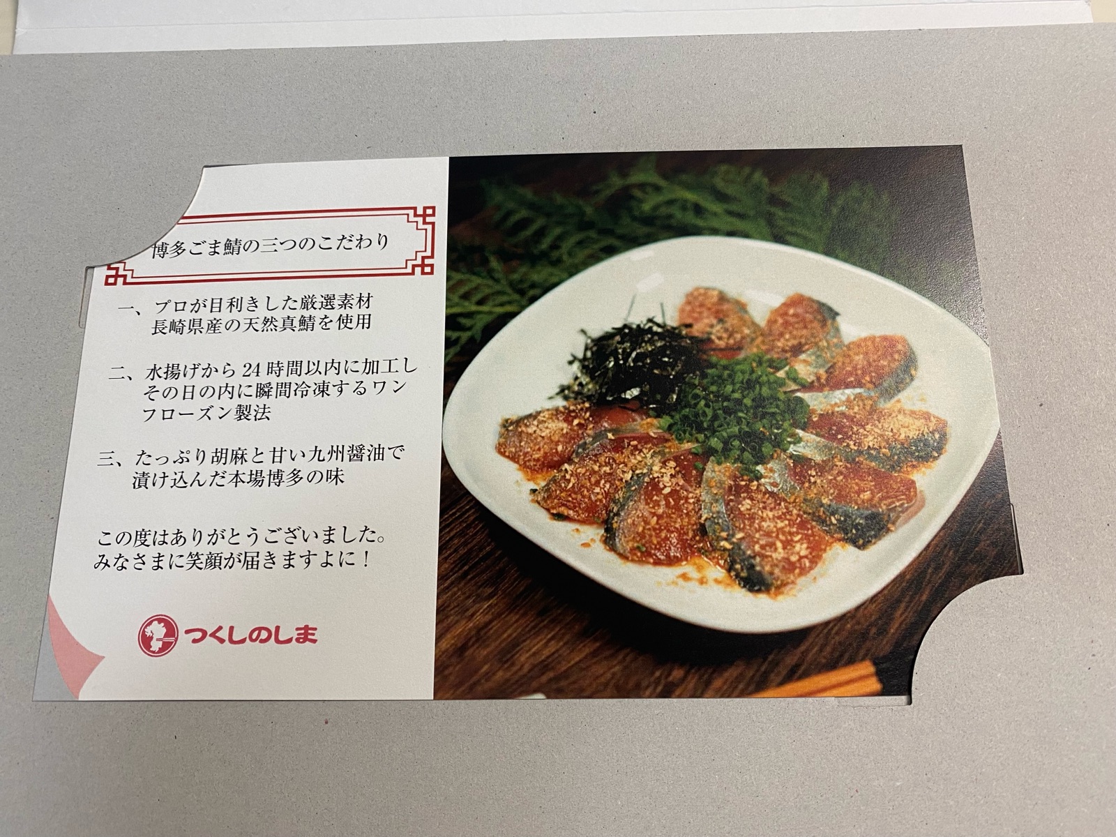 上蓋を開くと、「博多ごま鯖の三つのこだわり」と美味しそうな「ごま鯖」の写真