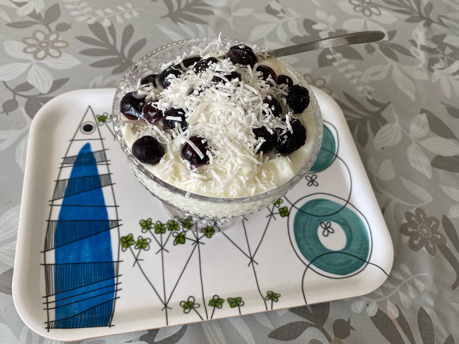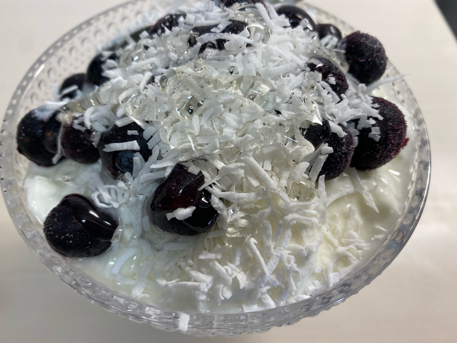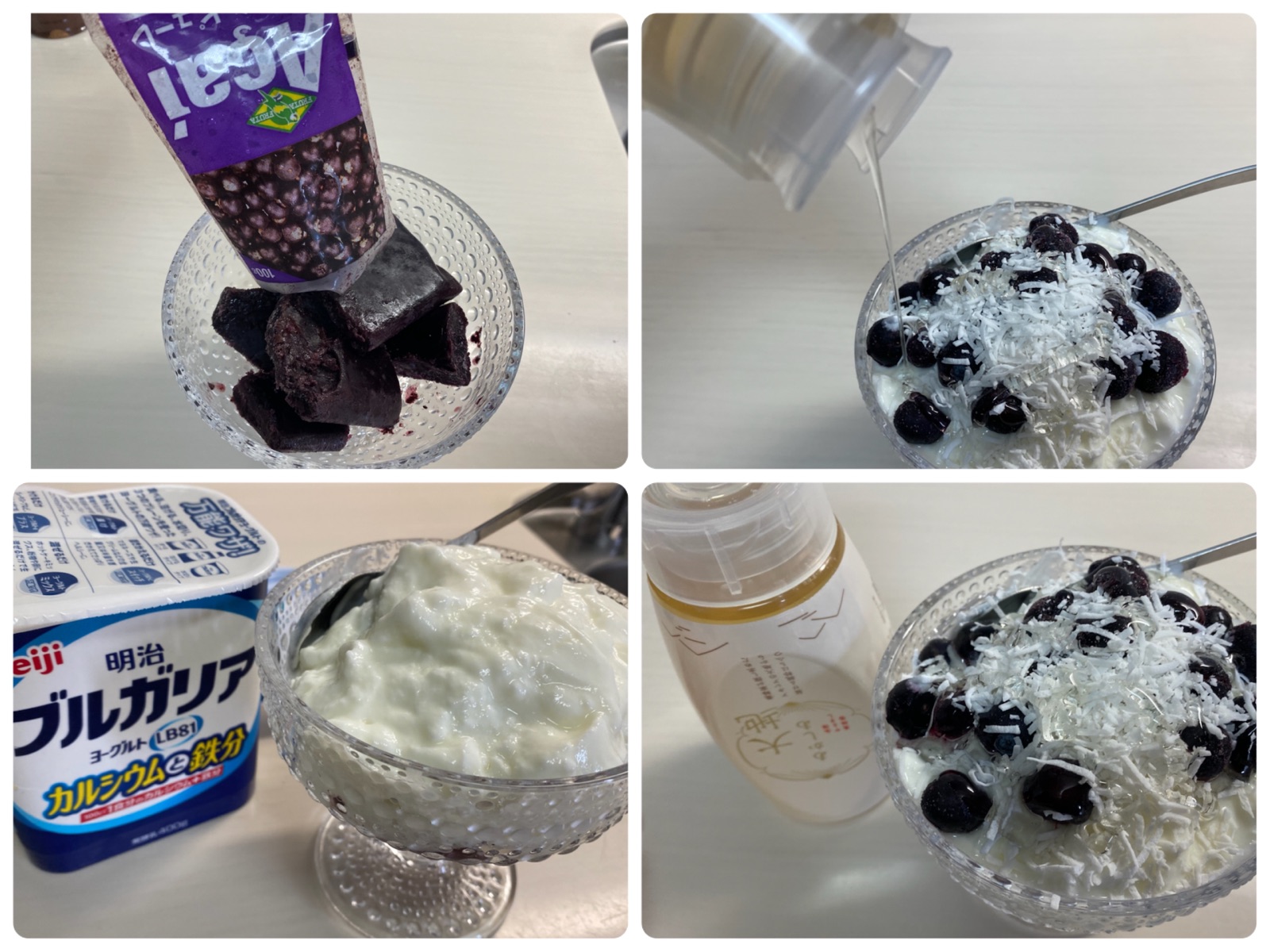 ↑アサイーを砕いてヨーグルト・ココナッツロング・冷凍ブルーベリーの上からはちみつ♪