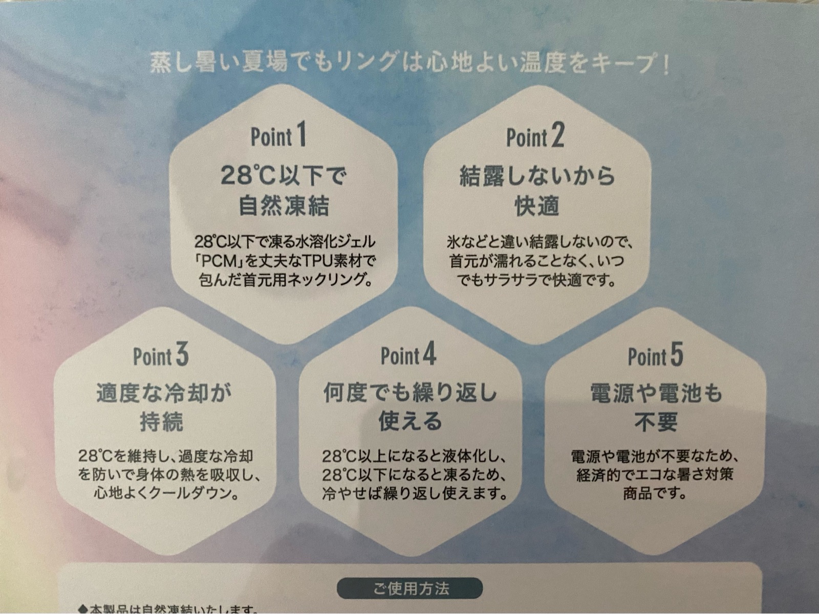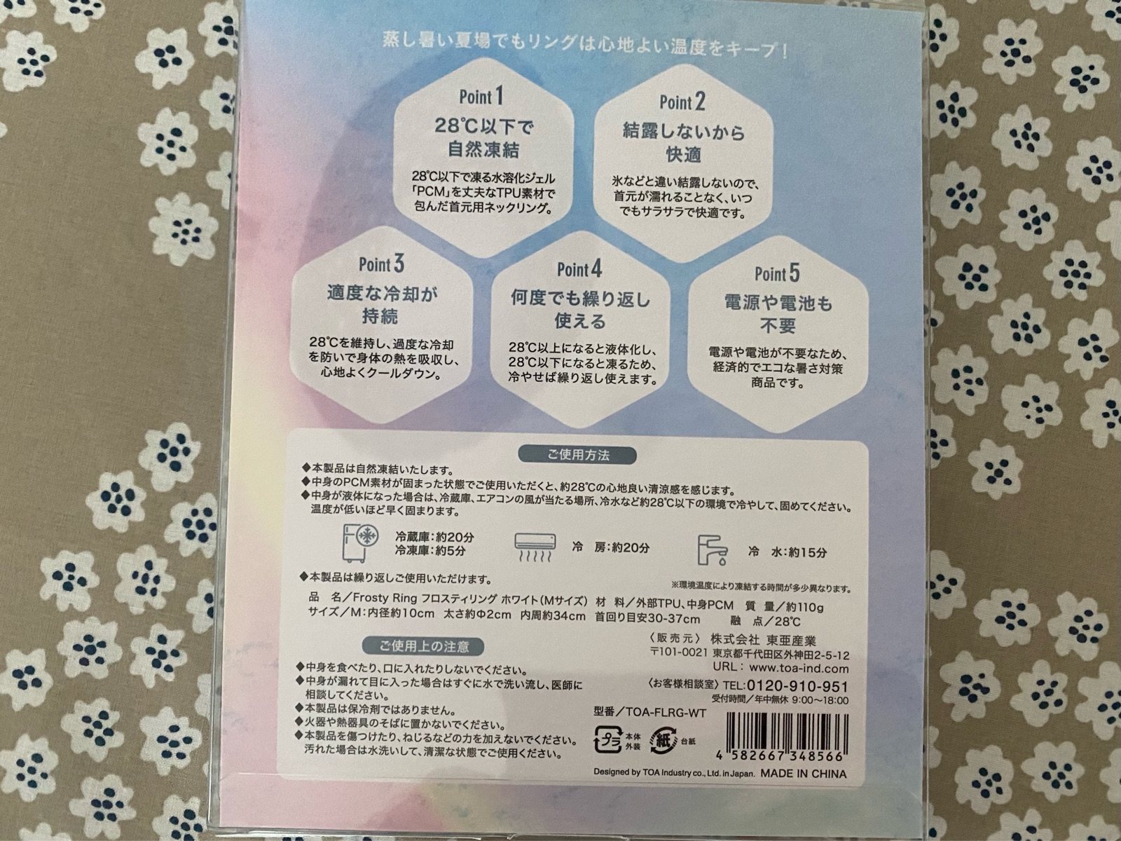 今回の素材は「PCM」と言う 28℃以下で自然凍結するNASAが開発した素材を使用しているそうで