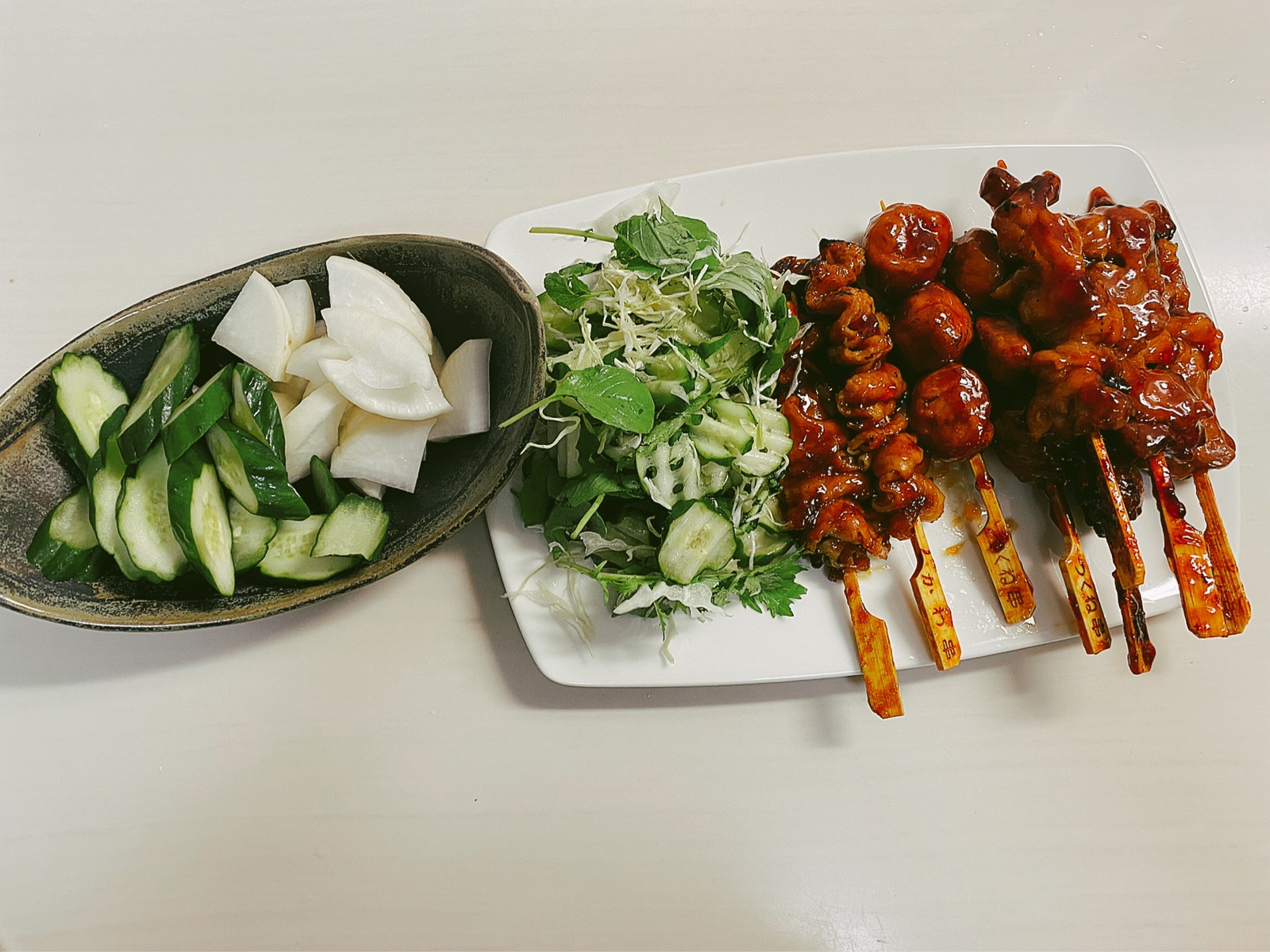 この日の晩御飯は、焼き鳥とぬか漬け♪