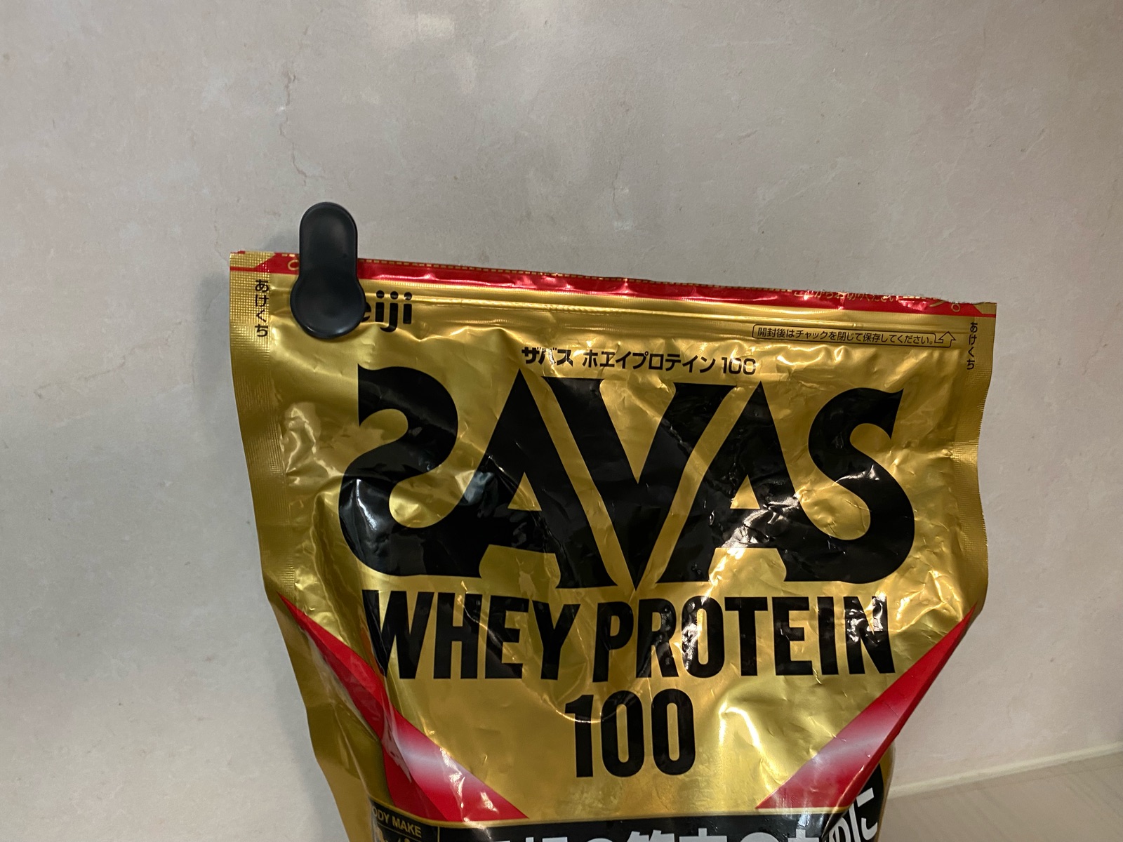これでチャック袋の閉め残しも防げ、野菜室がプロテインの粉まみれになることも防げるはず!!(笑)