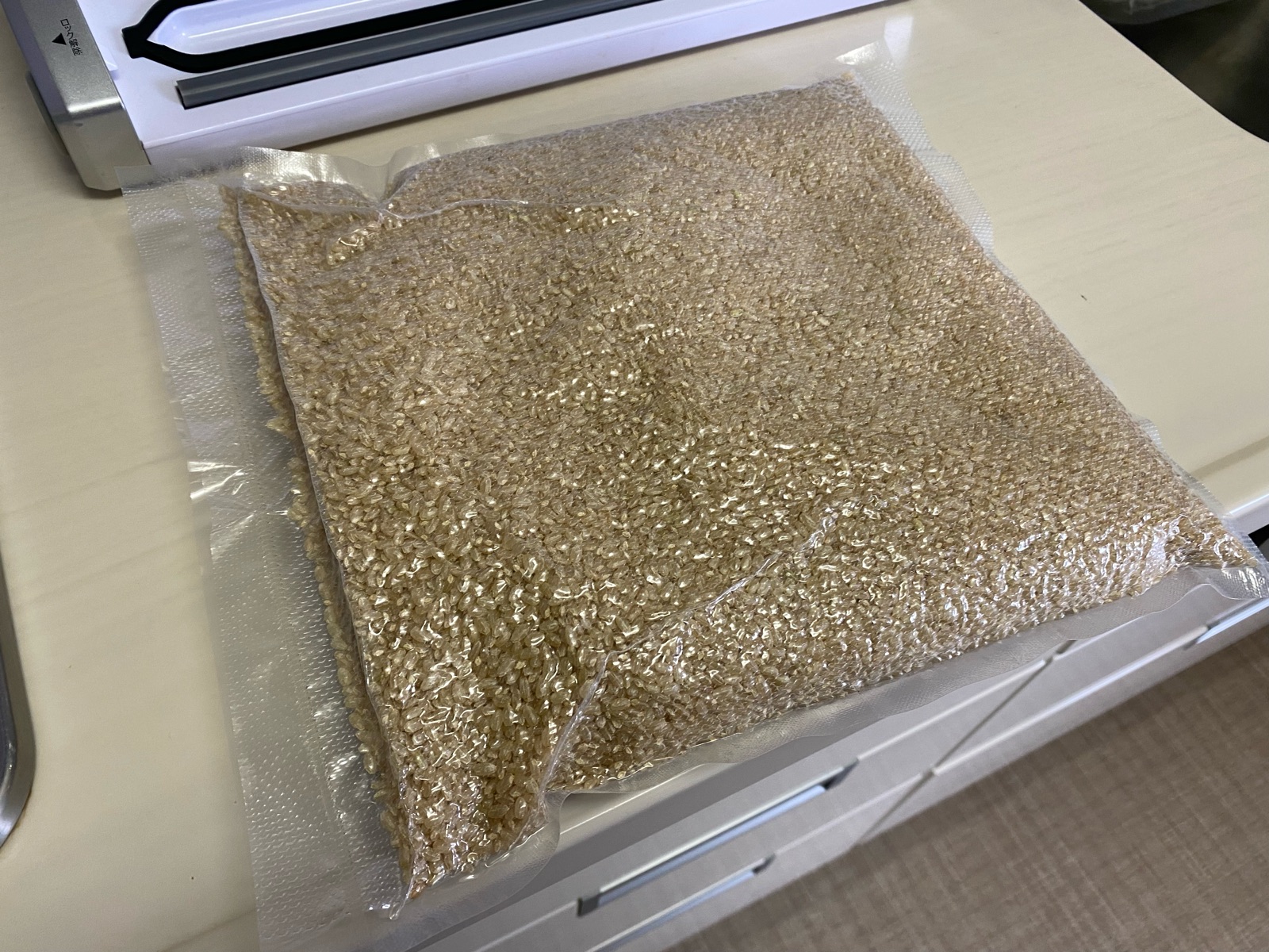 袋にお米を軽量したら、「真空パックん」で真空パック!