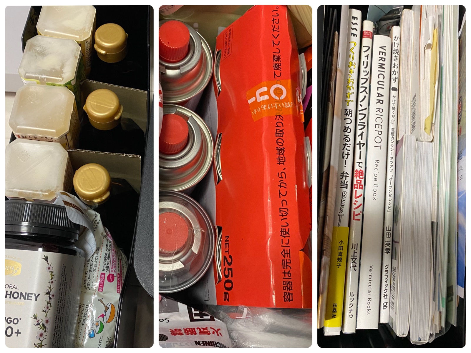 真ン中、奥にお米と同じケースには、カセットコンロのガスや固形燃料。