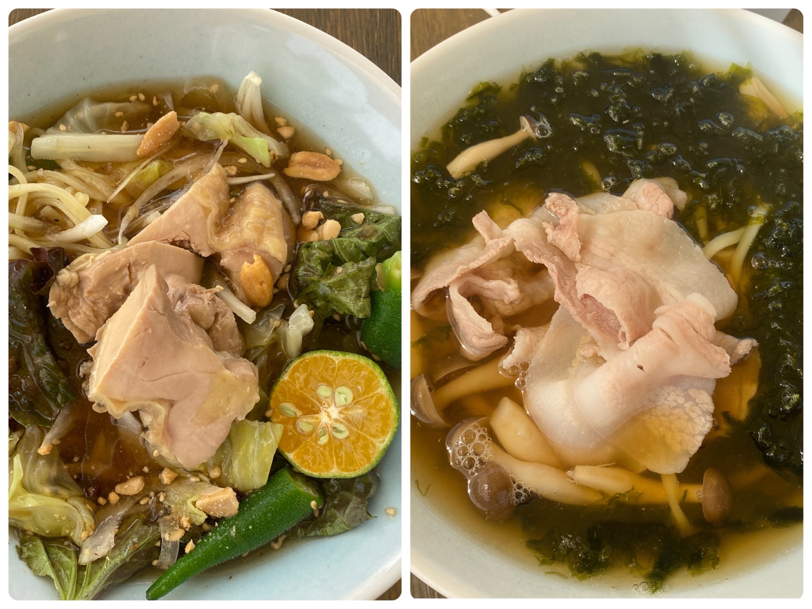 主人は左側の冷たいソーキそば。「蒸し鶏と島野菜の沖縄そば」