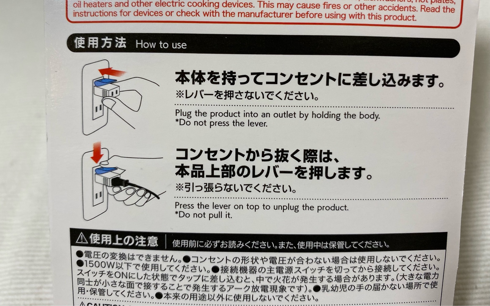 コンセントから抜く際は本品上部のレバーを押します。