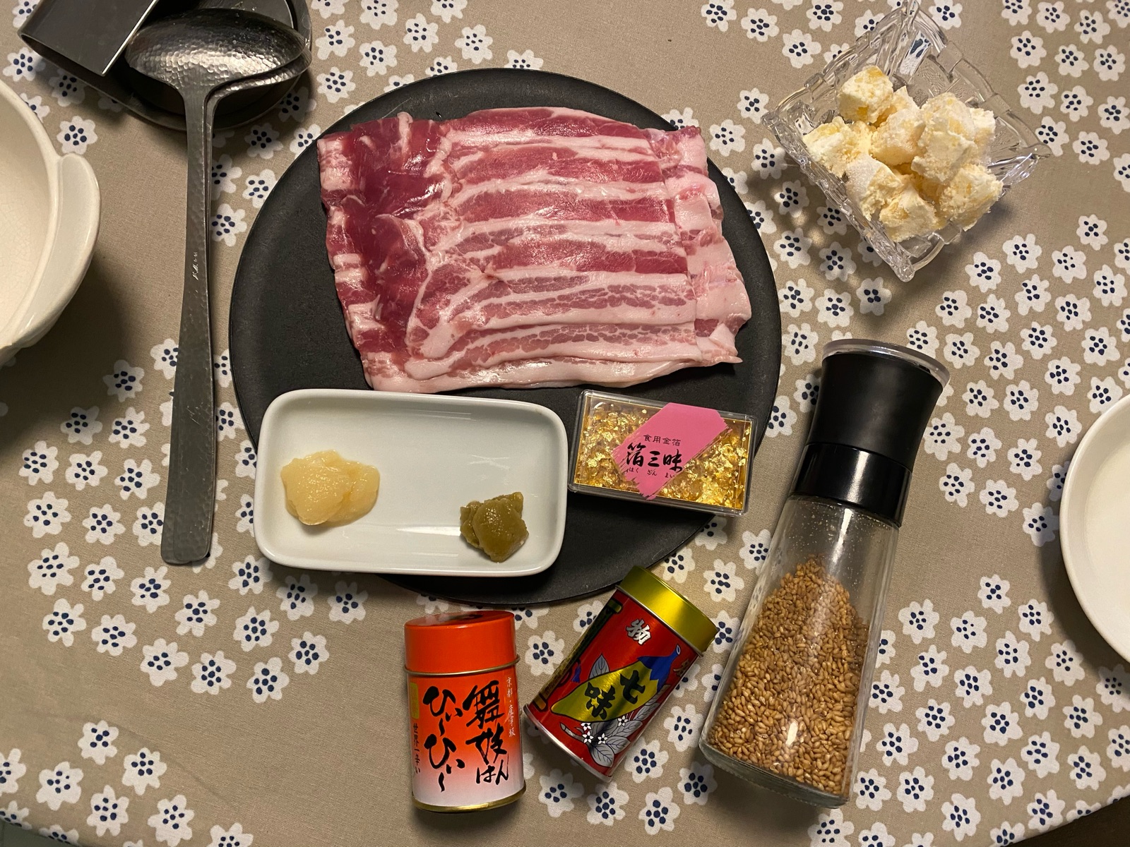 金箔だけじゃなく、にんにく・ごま・柚子胡椒・七味なども付属されていて