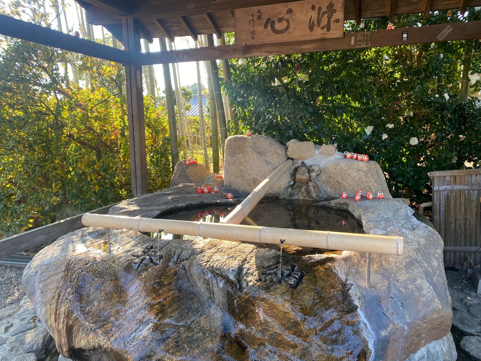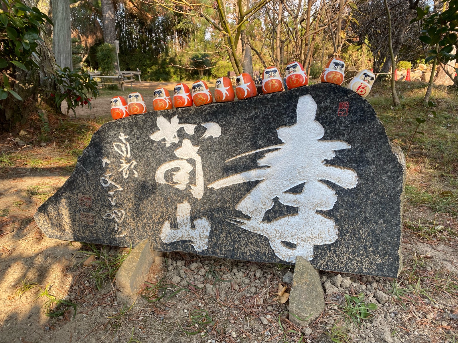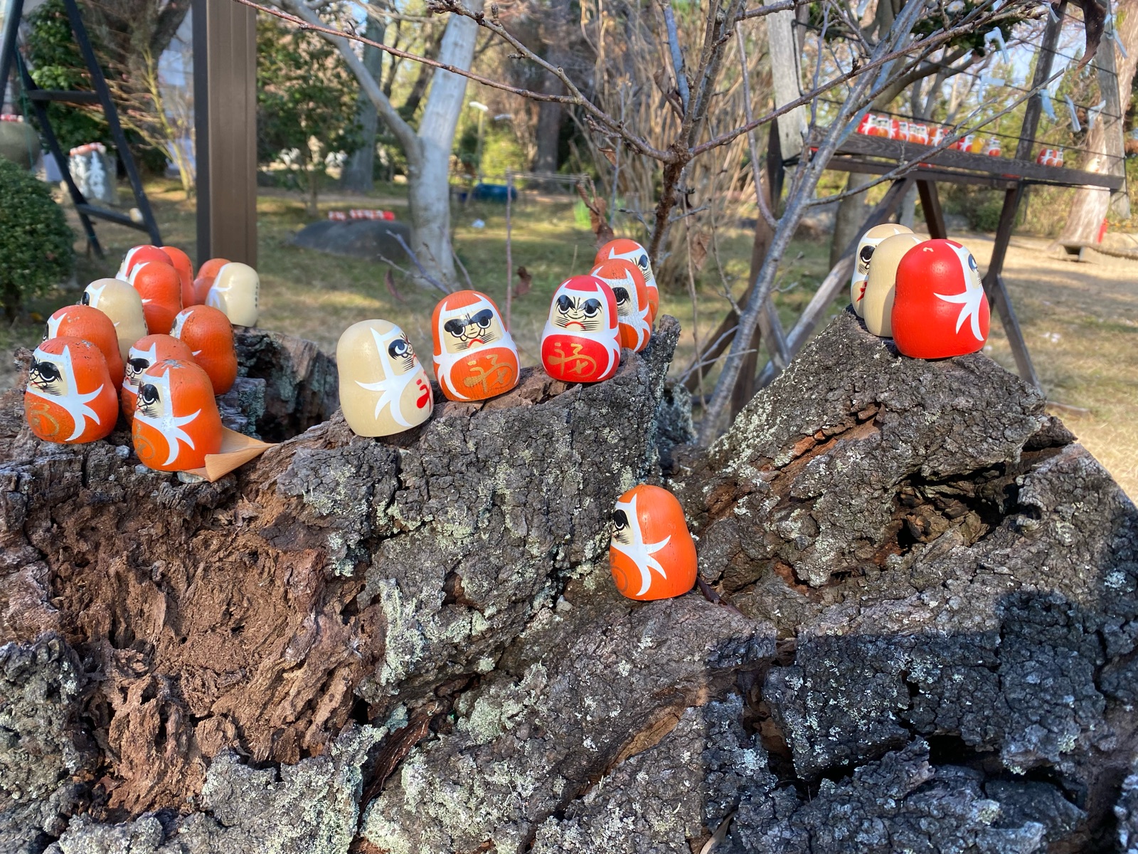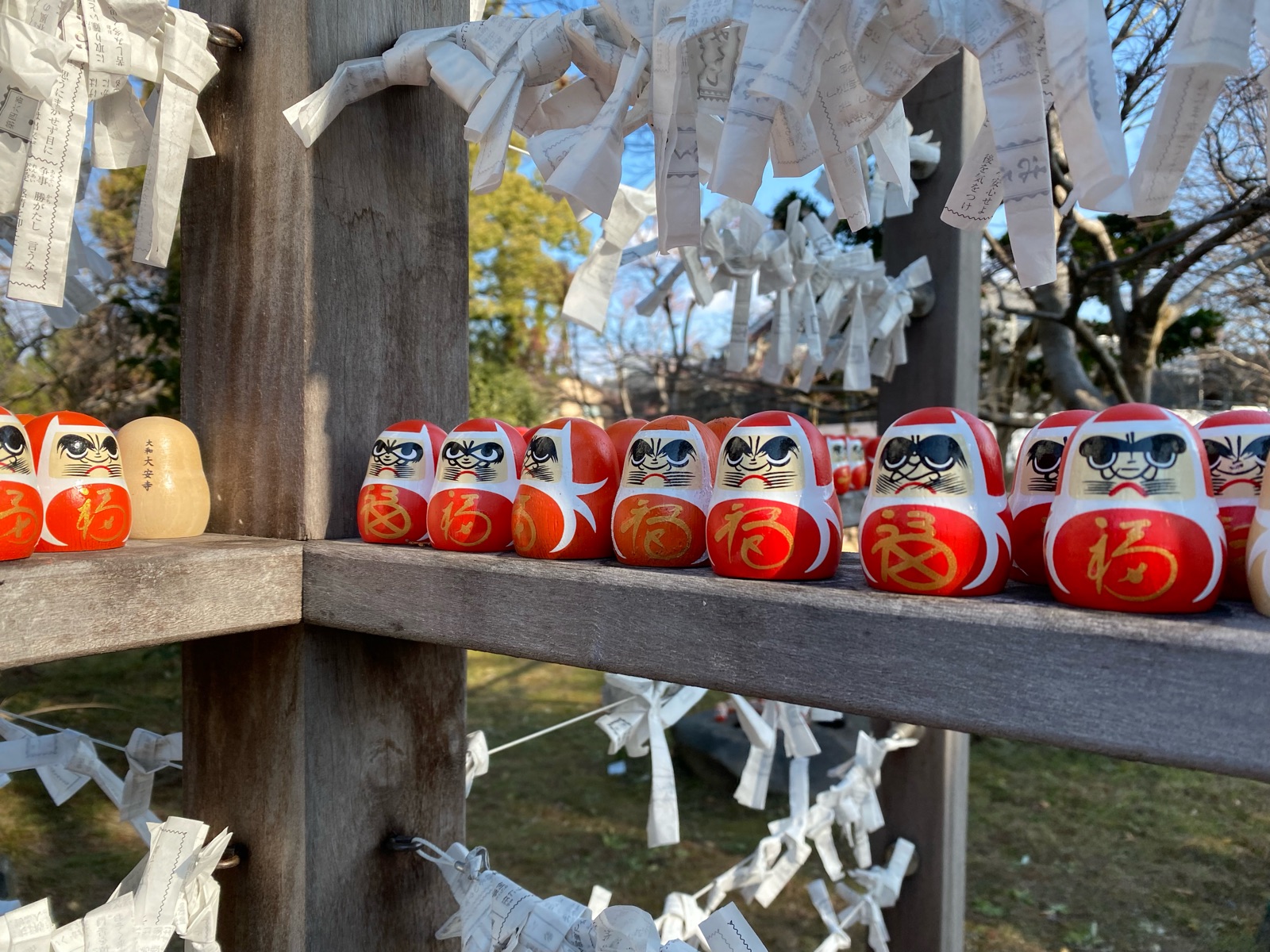 おみくじが「ダルマ」の中に入っていて、このダルマが境内アチコチに並んでいて