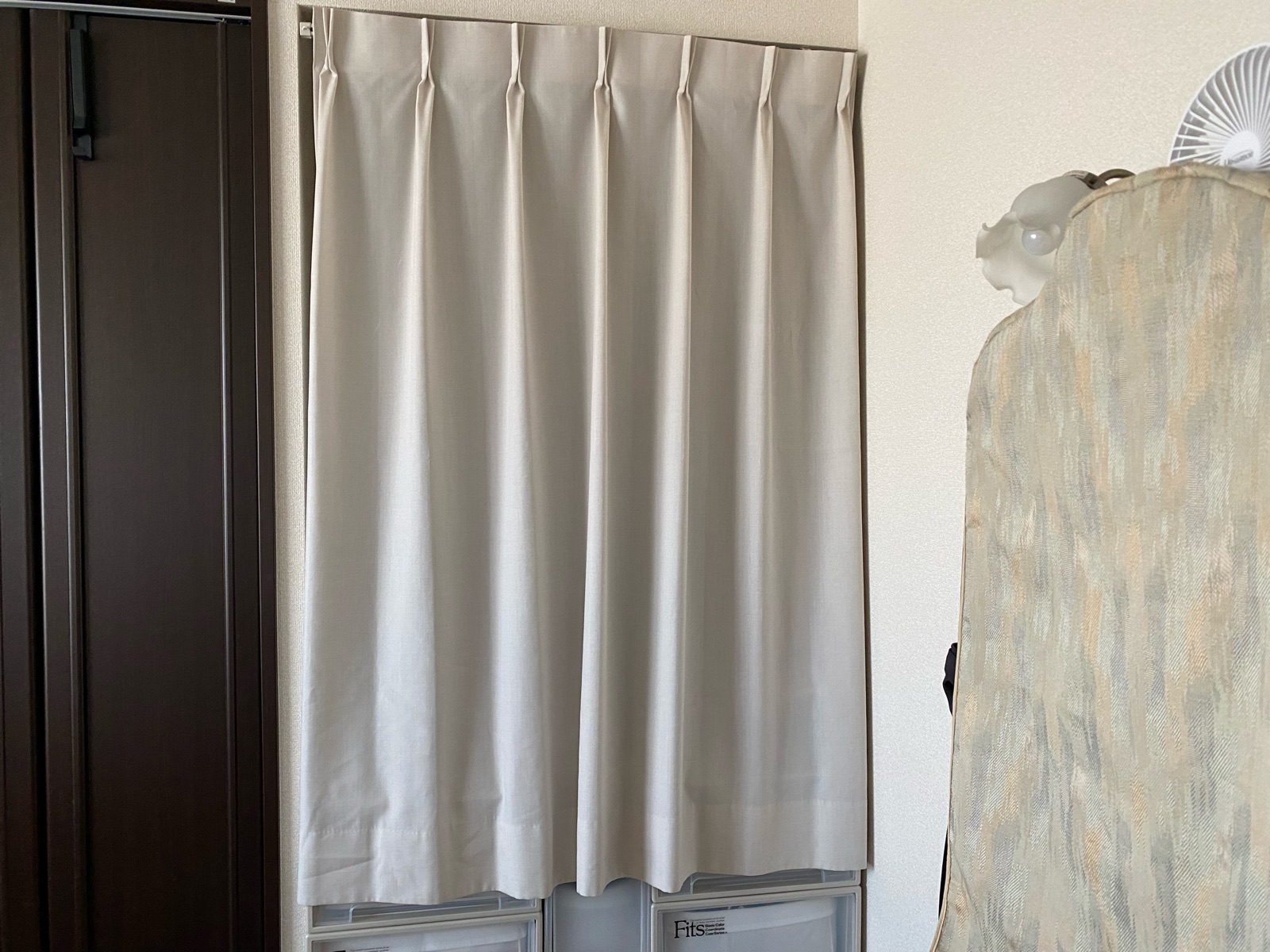 壁の穴は最小限で耐荷重は十分だろうと余っていたカーテンを設置。