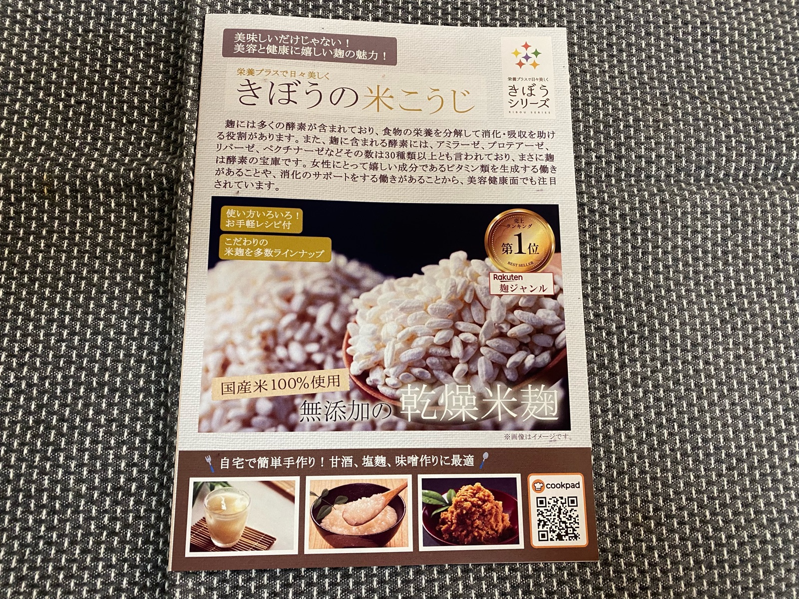 「乾燥こうじ」を使って作れる「こうじ水」「甘酒」「塩こうじ」「醤油こうじ」「発酵あんこ」の作り方レシピ付きでした。