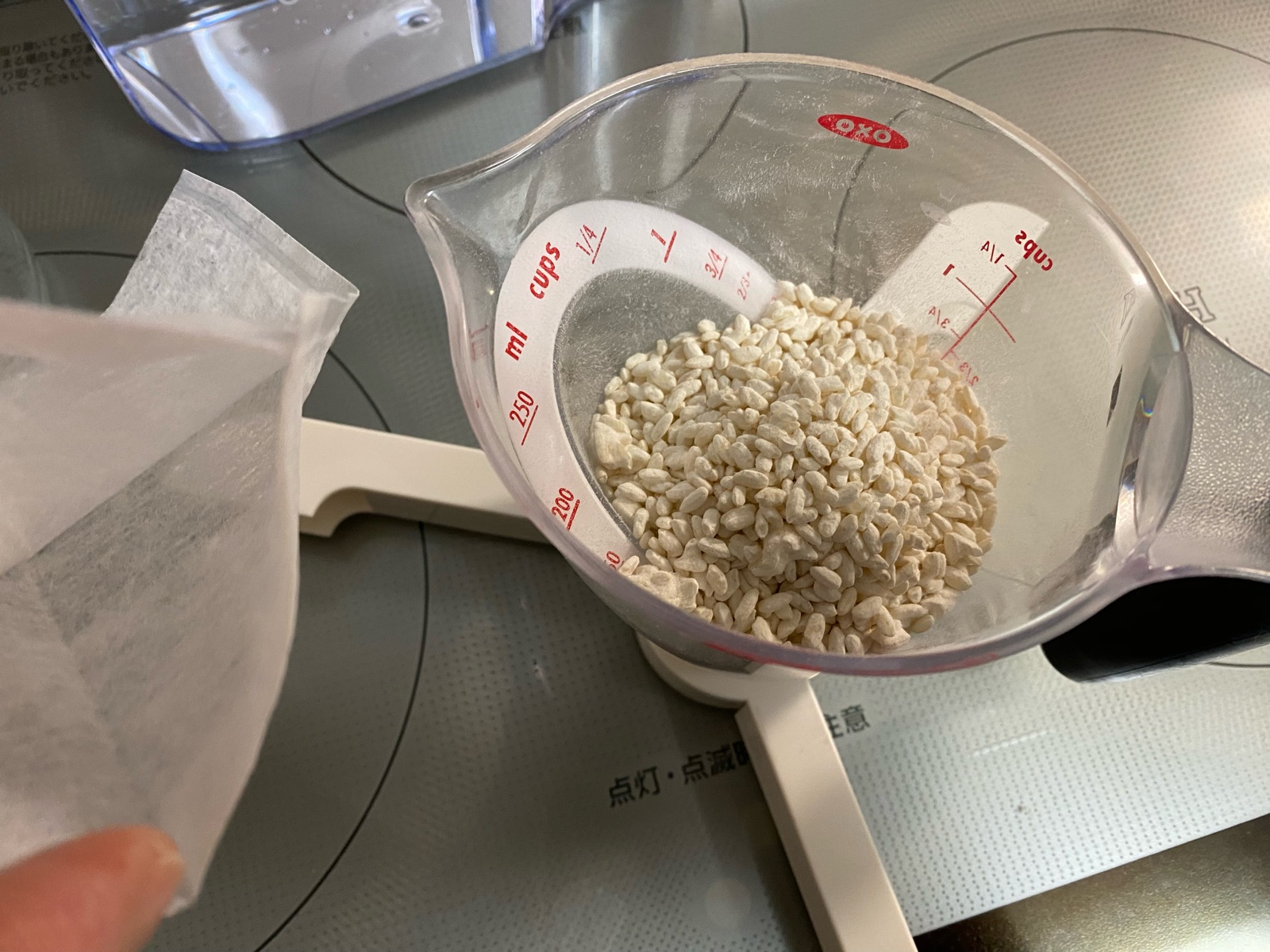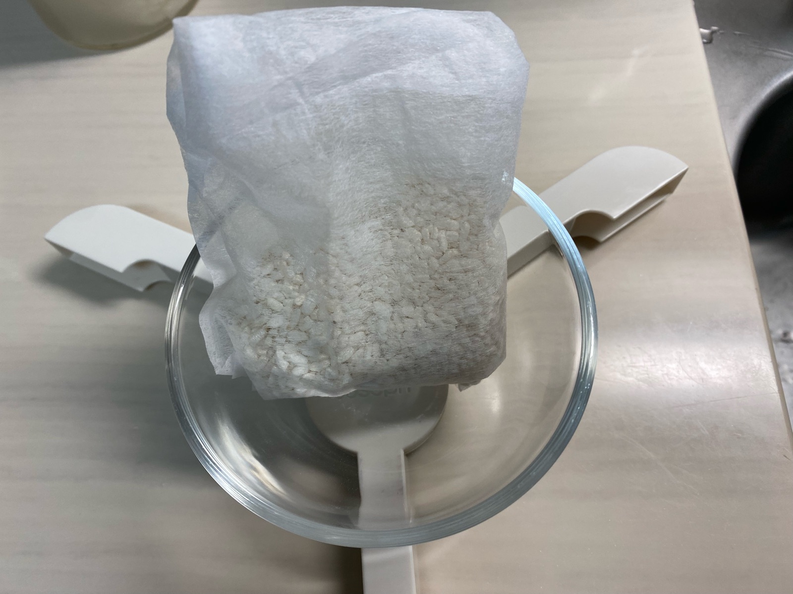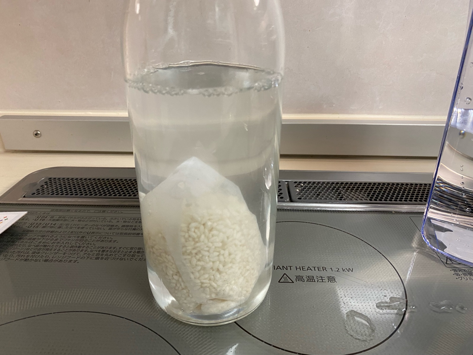 水の色は全然変化してなくて、「乾燥こうじ」が水を吸ってだし用パックがパンパン!!