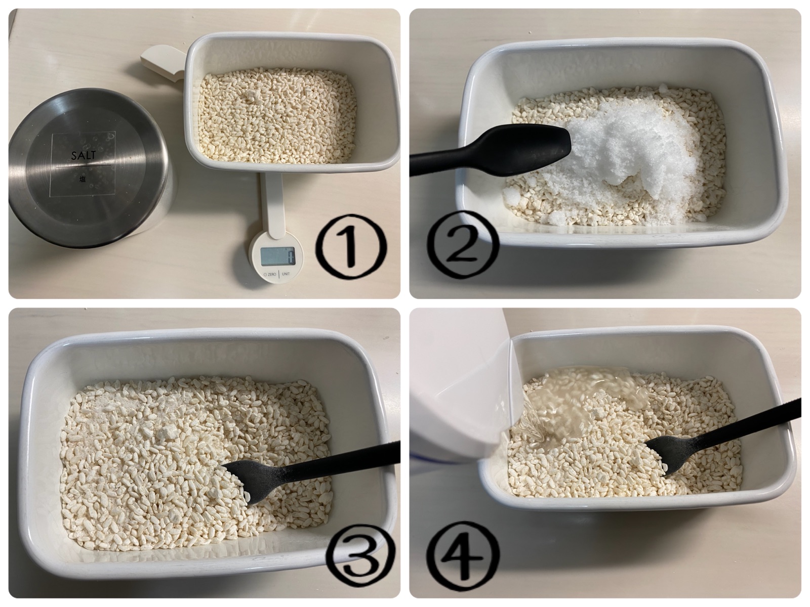 乾燥こうじに食塩を加え、まんべんなくかき混ぜ