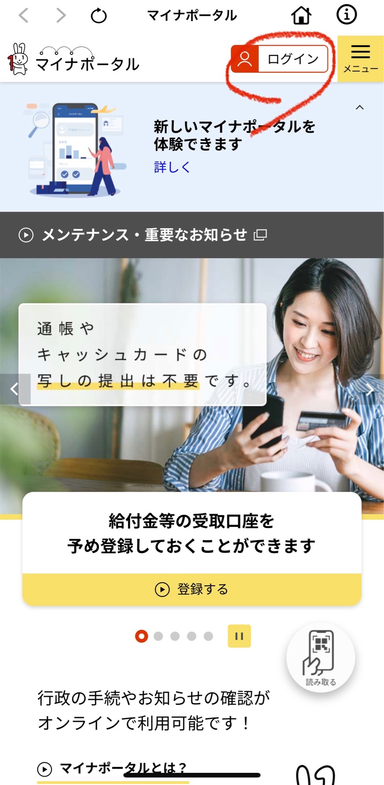 既に利用した事がある方は、マイナポータルのアプリを開き「ログイン」