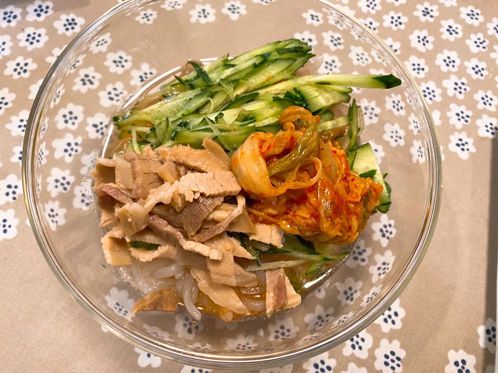 麺がみえていないけど冷麺。ラーメンにのせても美味しいはず!