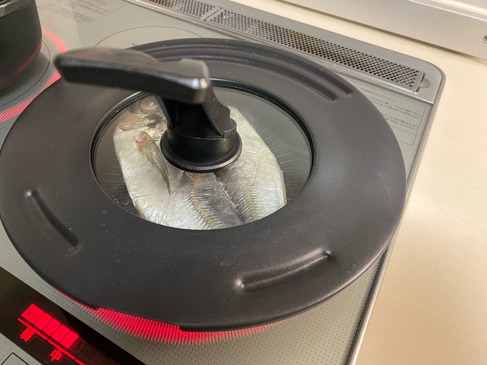 フライパンが温まったら、干物を入れ蓋をして・・・と焼き方の説明通りに焼けば